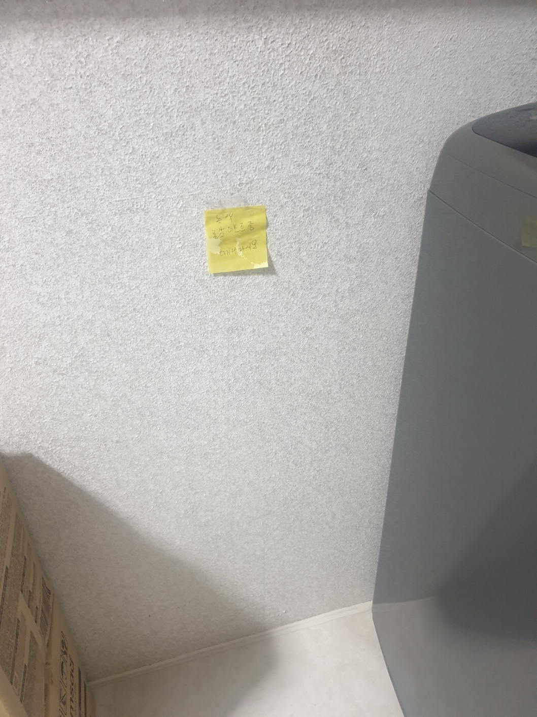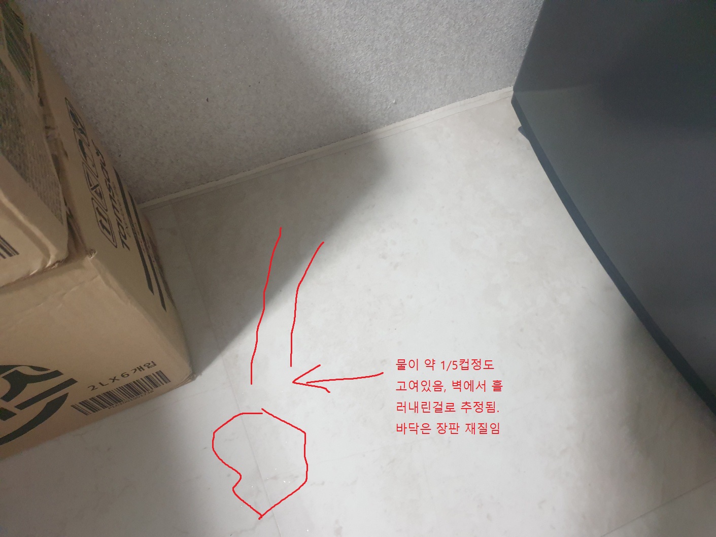 사진첨부합니다. 저기 벽에 확인용으로 붙여놓은 포스트잇이 방금나가보니 물이 흘러내려서 다 젖어있습니다.ㅠㅠ 바닥에도 물이 조금고여있네요. 물이 투명해서 잘보일란가 모르겠습니다.