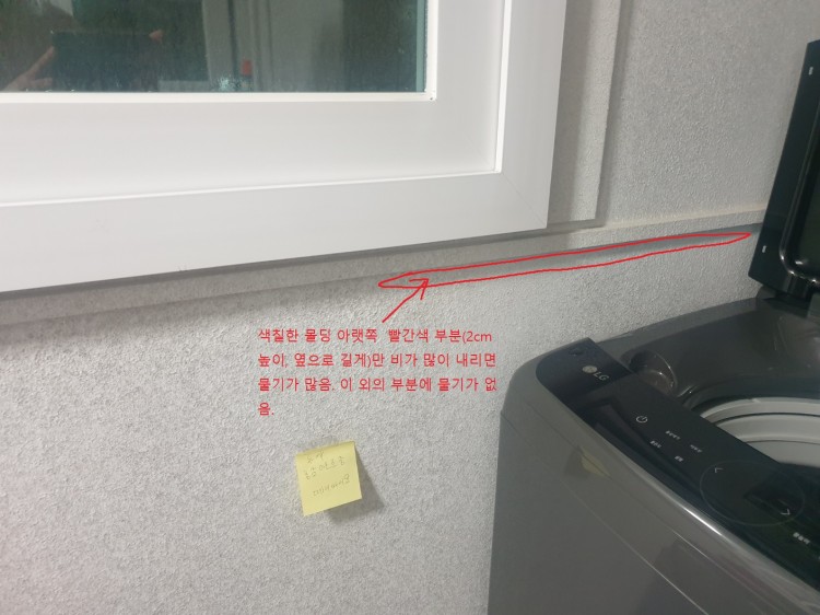 저 빨간색 표시한 부분외 다른 부분들( 몰딩 상단 부분, 샷시 외곽쪽, 천장, 근처 벽, 세탁기용 수도꼭지 어디에도 습기, 물기) 없습니다.