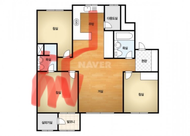 빨간색으로 표시한 싱크 밑 분배기~안방 부분이 예상되는 몰탈 철거 범위입니다.