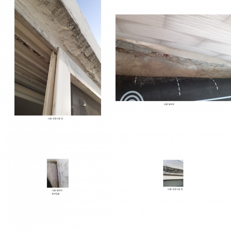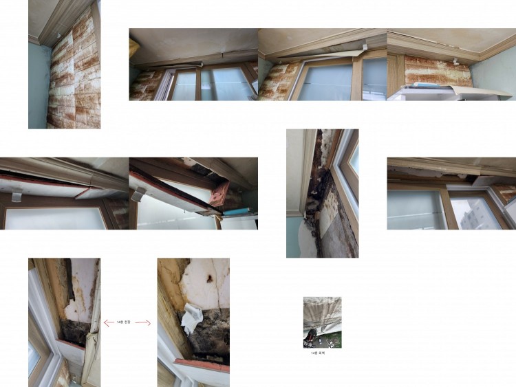 의심가는 곳은 14층 창틀윗부분, 15층 창틀코킹, 외벽균열인데 정확한 원인이 무엇인지 찾고싶습니다