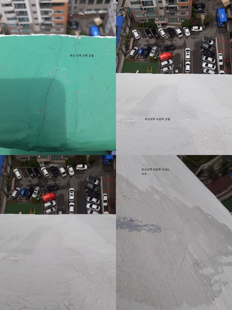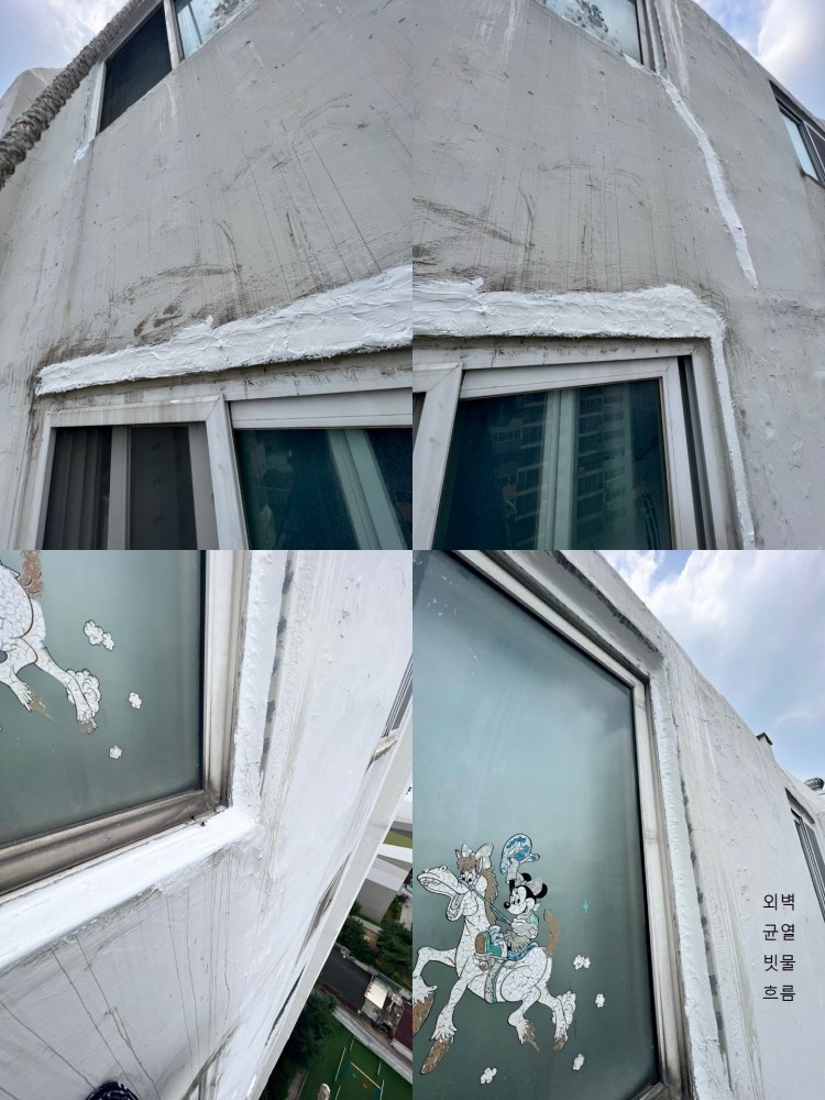 창문 주변의 실리콘 코킹을 다시 하신 것으로 보아서, 창틀 주변으로의 누수는 일차적으로 배제를 하는 것이 나을 것 같습니다.  나머지는 외벽/지붕의 균열인데..  아파트의 외벽이 워낙 노후화되어 있어서, 사진에 보이는 균열 만이 전부로 보이지는 않습니다.