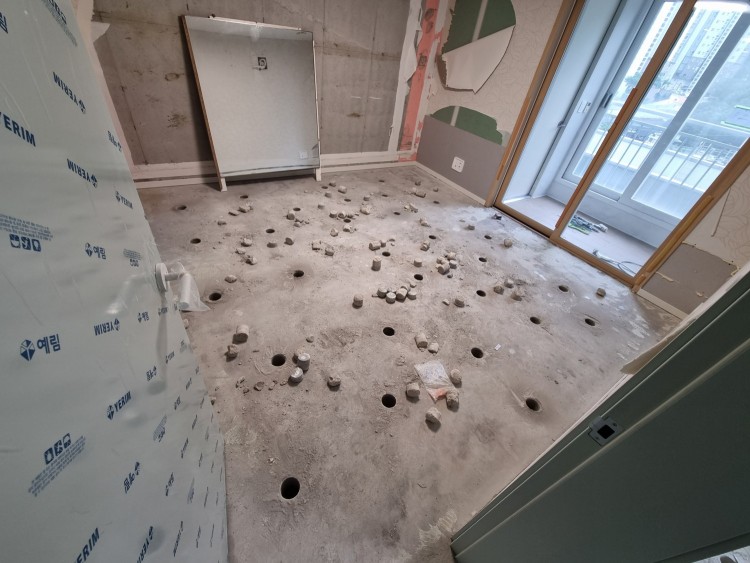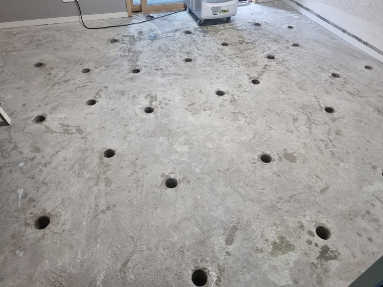 문제는 6월중순 침수되어 장마기간을 지나면서 건조가되지않는 상황입니다. 8월부터는 첨부파일 사진처럼 난방배관을 열화상카메라로 피해서 타공을하고 습기가 빠져나가도록 하고 보일러를 가동하면서 환기도시키고 제습기도 돌리고있습니다.