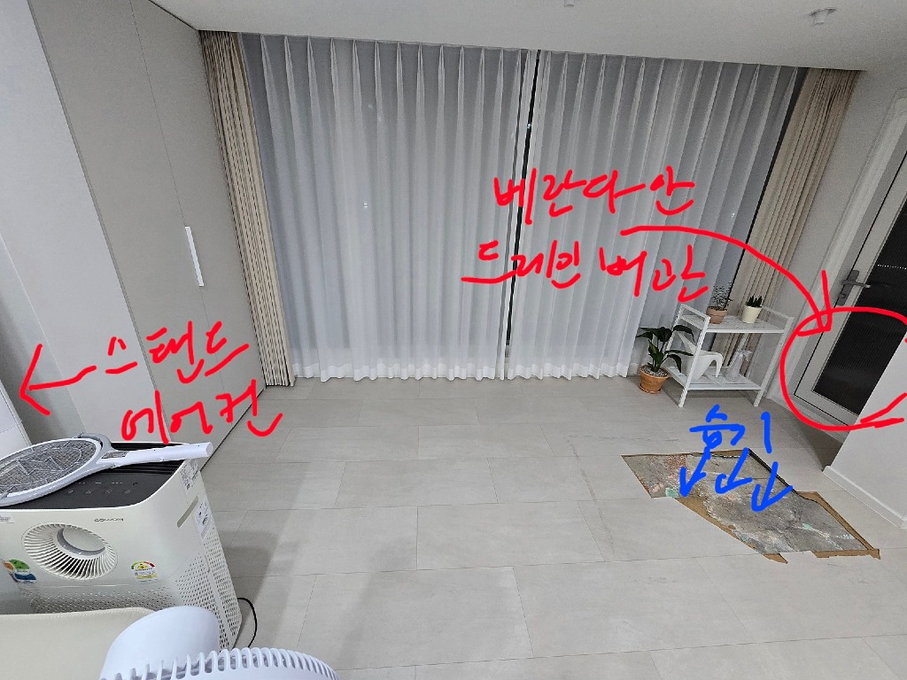 스탠드 에어컨이 사진에 보이지는 않지만 거실사진과 배수구의 상황으로 볼때, 구조상 자연배수는 구현을 할 수가 없는 구조라서 스탠드 에어컨의 아래쪽에 물펌프를 설치 해 놓고 펌프 아래에 통으로 결로수를  받아 펌프를 이용하여 배수를 했던것으로 예측이 됩니다. 물펌프를 이용하여 물 배수를 하였다면 보통은 물펌프의 압력으로 인하여 Drain 호스의 끝부분에서 배출되는 물의 압력으로 베란다 바닥이 넓은 부위가 물이 젖고 많이 튀어서 금방 인지를 할 수 있었을텐데요. 물펌프가 설치가 되어져 있지 않다면 거실 바닥으로 드레인배관이 지나갔다는 건데....인테리어를 할때 스탠드 에어컨이 설치가 되어져 있었느냐! 없었느냐에 따라 귀책 상황은 많이 달라 질수 있겠습니다.