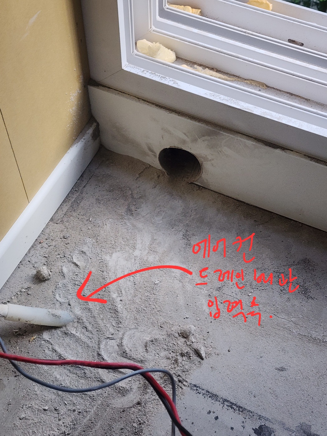 에어컨 (Heat pump) 시장에 몸담고 있는 입장에서 물배관을 바닥에 묻었다는것이 참으로 당황스러운 현장입니다. 후일을 위하여 잘 하지 않는 시공법입니다. 거실 창틀 보호 측면에서 바닥을 이용한것으로 보이며 마지막 사진의 외창 아래에 타공 위치를 활용하는 방안도 있었을텐데 아래에 무언가 있었을까요?  아무튼 바닥에 물 (Drain)배관이 묻혀있다면 실내기의 결로수 위치(높이)에서 물배관 말단의 높이 차이에 의한 배수가 되었을테니 조금씩 흘렀을것이고 현재 발생한 상황으로 연결이 될 수 있겠습니다. 말씀 주셨듯이 drain 배관의 구배가 맞지 않다 보니 에어컨을 사용하지 않을때 Drain 배관 내부에 결로수가 고여 곰팡이와 먼지와 결합하여 배관을 조금씩 막아 버리는 상황이 생길수도 있으니 결로수가 잘 배수가 되지는 사용하시기 전, 후로 잘 확인 하시기 바랍니다.