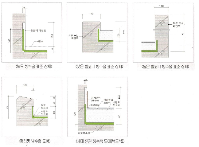 여기서 '방수홈'이 치켜올림 방수를 하기 위해 콘크리트를 일정 정도(보통 12mm) 들이밀어 시공한 부위를 일컫는데, 현장에서는 일본말로 '히꼬미'라고 합니다. 홈이 파인 부분에 방수하고 그 위에 미장을 해서 원래 콘크리트와 동일한 단면이 되게 합니다.