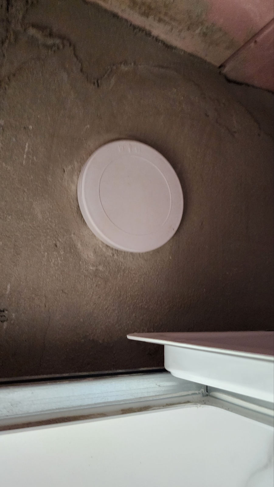 오수관, 우수관, 환풍배관 중에 하나이며(하자보수쪽에서 아직 정확하게 파악이 안되었습니다.)원형의 점검구는 배관의 육안점검이 어려운곳(콘크리트 이면)에 위치하여 내시경을 통해 점검하는 점검구 역할이라고 합니다.