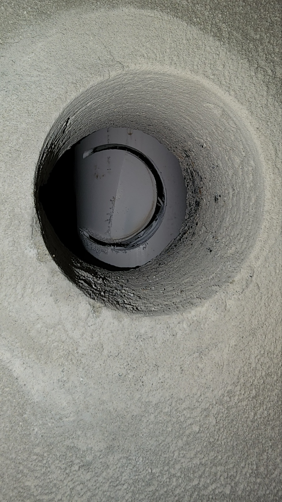 해당세대는 탑층인데 아래층 누수가 있어 하자보수팀에서 내시경장비를 가지고 탑층세대 점검하려고 가보니 점검구 시공이 누락되었습니다. 누락된 점검구를 천공하면서 이면에 있던 배관을 파손시킨 경우입니다.