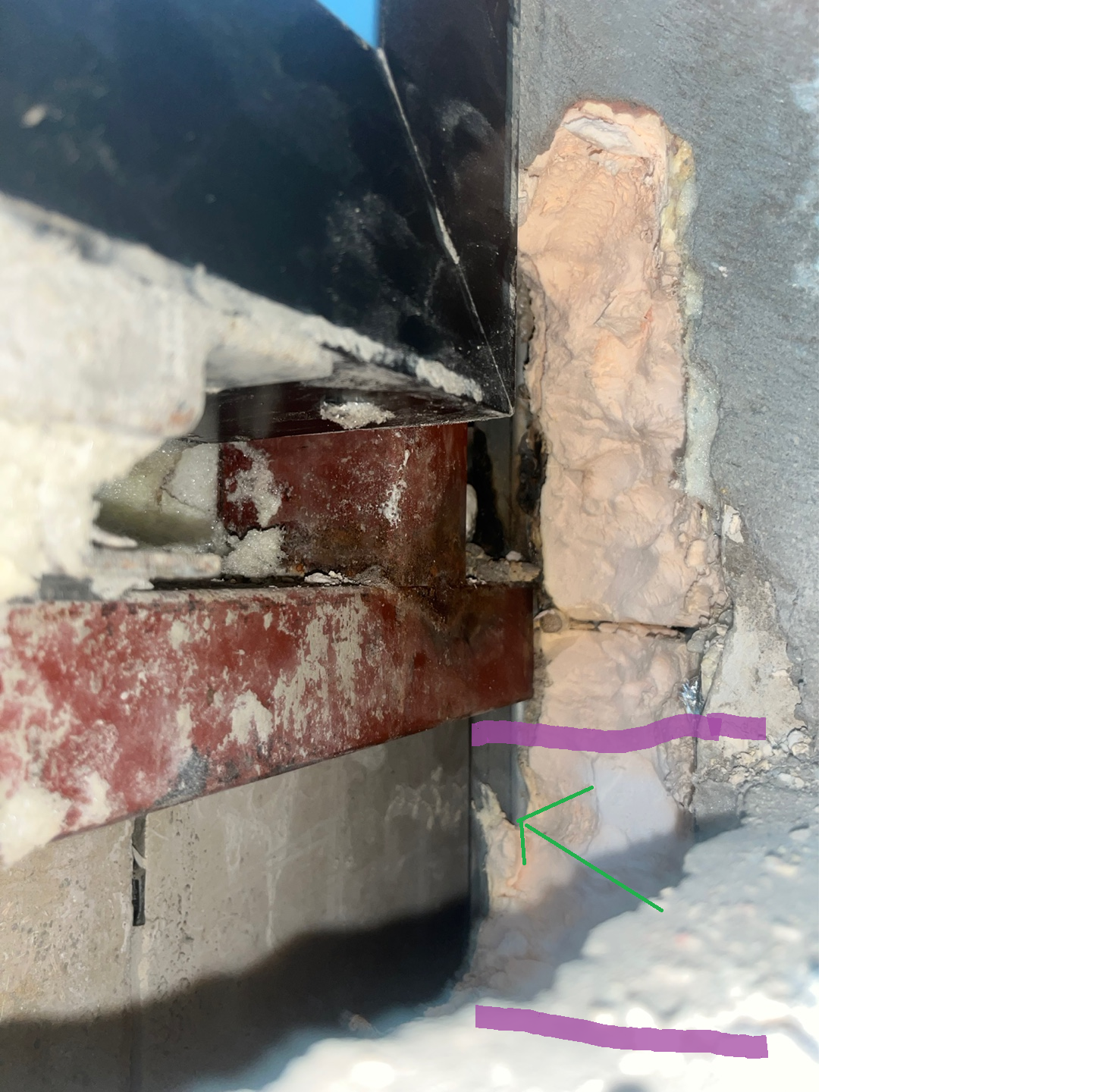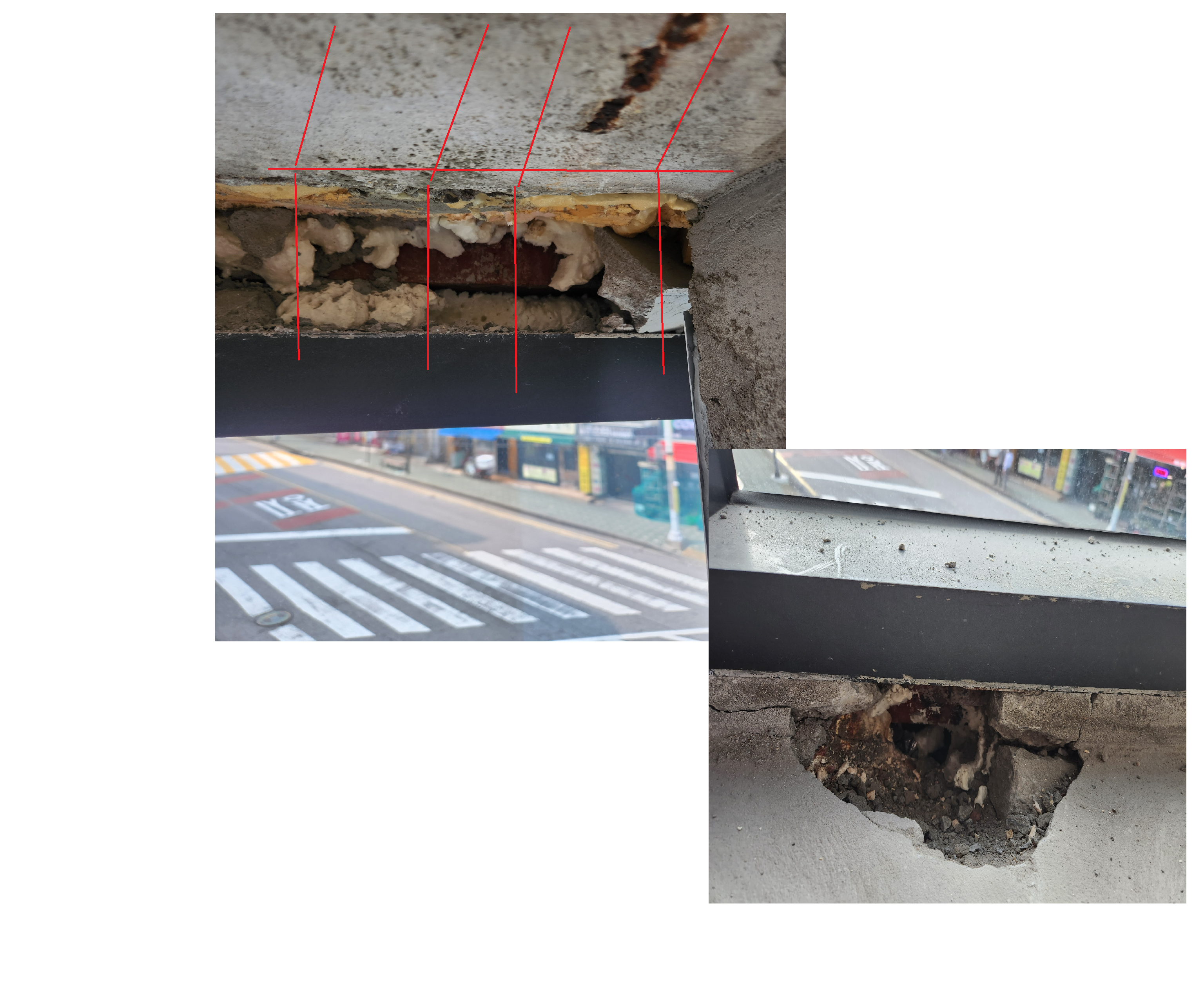 4층 중 2,3층 상부석재 한줄씩만 제거하고 시공을 계획하고 있습니다.  4층 파라펫부위 전체를 덮도록 내년 여름 전 징크로 시공을 계획중이라  2,3층만 계획중입니다.  초록색 표시된쪽 기둥쪽을, 내부에서 창호 상부를 일부철거한 사진을 아래에 첨부해드리겠습니다  참조하셔서 조언을 부탁드리겠습니다 ㅠㅠ