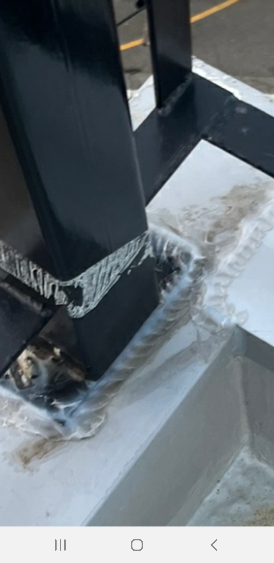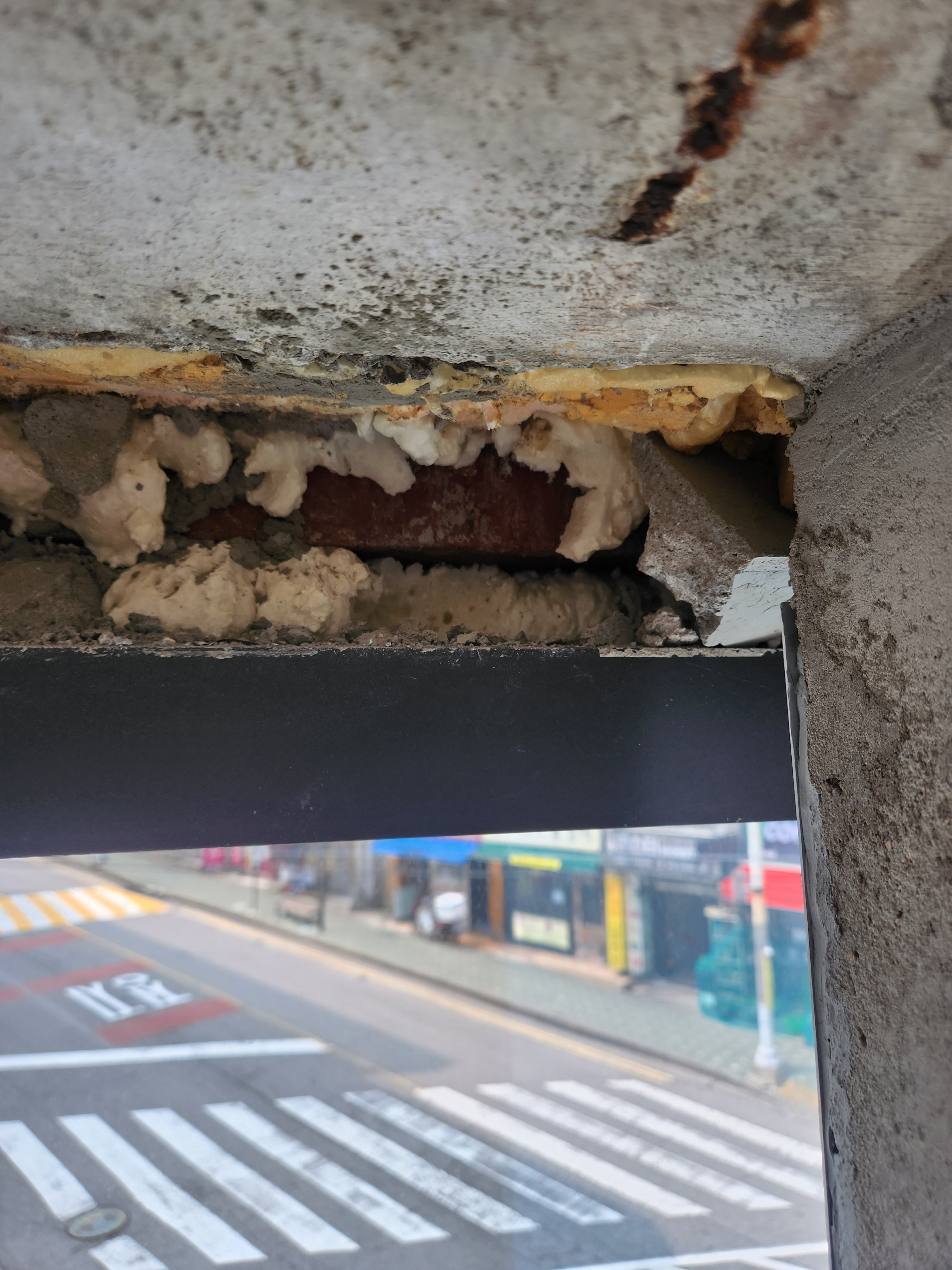 이런 구조로 창호가 각관에 올려져 있습니다...  트러스에  철근 한가닥으로 용접한 부분의 각관이 저렇게 녹슬고 구멍나고 있는데  창호가 떨어졌다는 뉴스가 나오는건 아닌지 모르겠습니다.