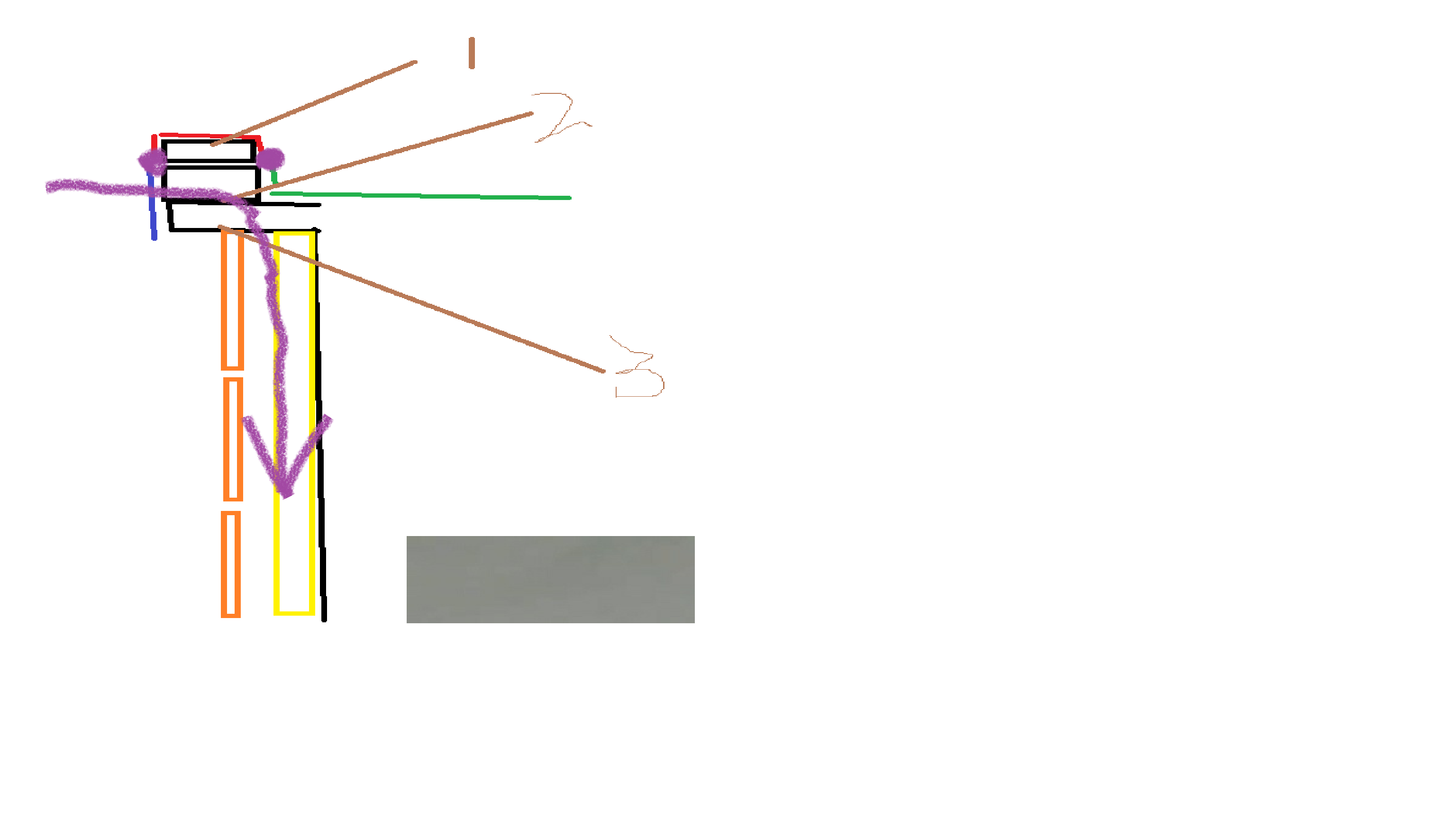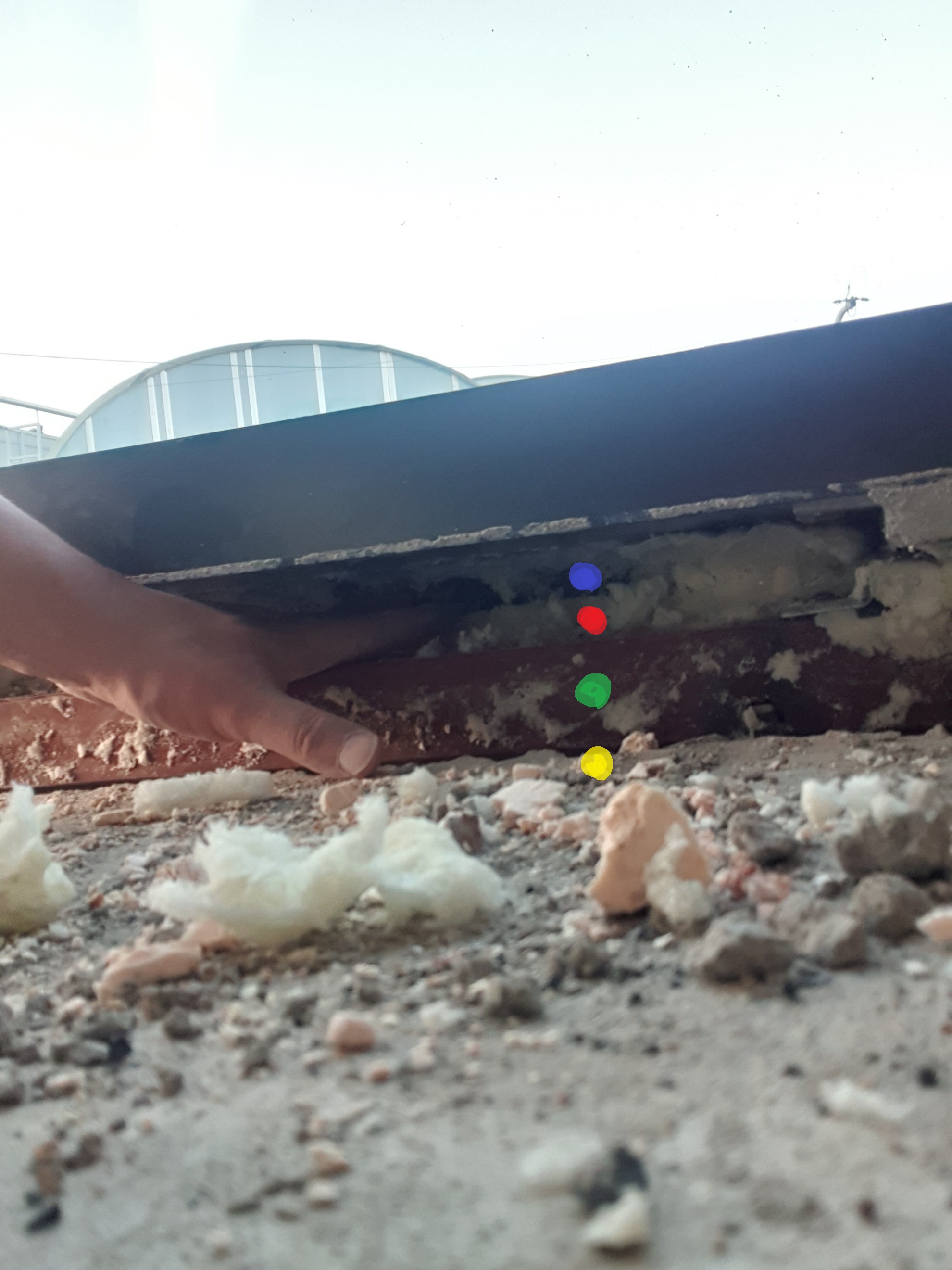 4층 창 상부인 보라색 부분에서는  물이 비친적은 없었습니다.  창 하부인 파란색은  군데군데 물이 가끔 비칩니다.   철판과 스타코 사이를  쭉 둘러가며 손을 넣어봤더니, 빨간색 부분에서 저렇게 아래에서 비어있는 부분이 보입니다. (옥상에서 밖으로 핸드폰을 내서 찍었습니다.)