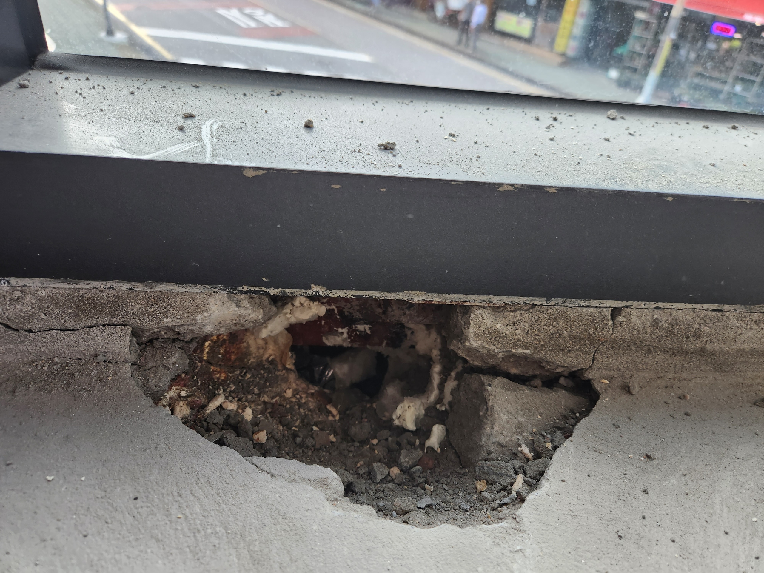 각파이프와 창틀 사이로 하는 조치는 지금 폼이 붙어 있는 상태에서는 그리 효용이 없습니다. 하려면 모두 깨끗이 제거를 해야 합니다. 다만 그 사이의 조치가 도움이 될 수 있지만, 근본적으로는 콘크리트와 창을 사이가 모두 실링이 되어야 합니다. 그 양이 넓어서 그렇긴 하지만... 지금 상태에서도 작업이 가능하긴 합니다.