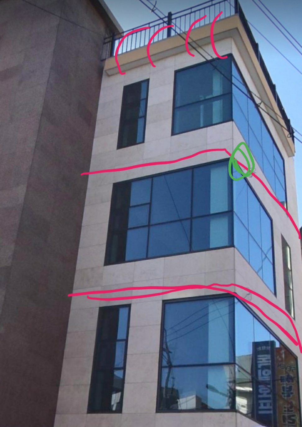 파란색 스타코 부위를 통해서도 석재 뒷편으로 물이 유입될 가능성이 있지 않나 생각은 하고 있었습니다만,  오히려  옥상 바로 아래층  창호의 상부는  단 한번도 물이 비친 적이 없어서 그 가능성을 과소평가 했던 것 같습니다.    초록색 부위가 주로 창 상하부의 물이 비치는 부위이고요,  초록색 동그라미 부위는 비가 많이 오면 물이 뚝뚝 떨어지기도 합니다.  각 층의 간판선이 뽑아져나온 부위를 의심하기도 했는데... 아직은 확인이 안되었습니다.