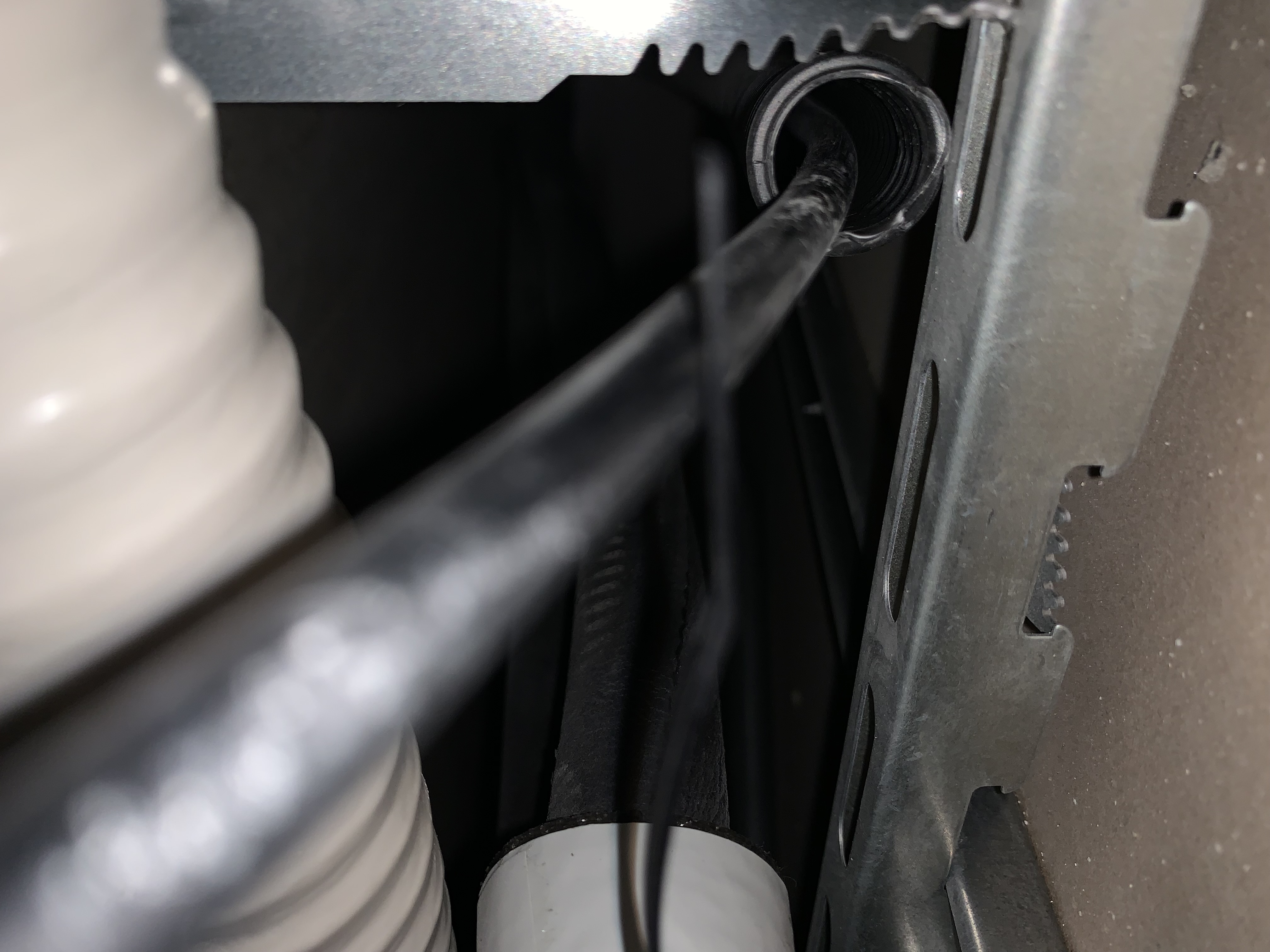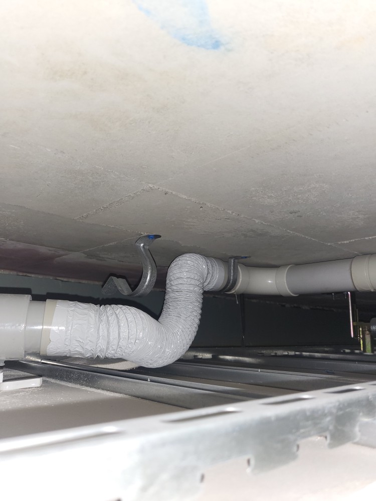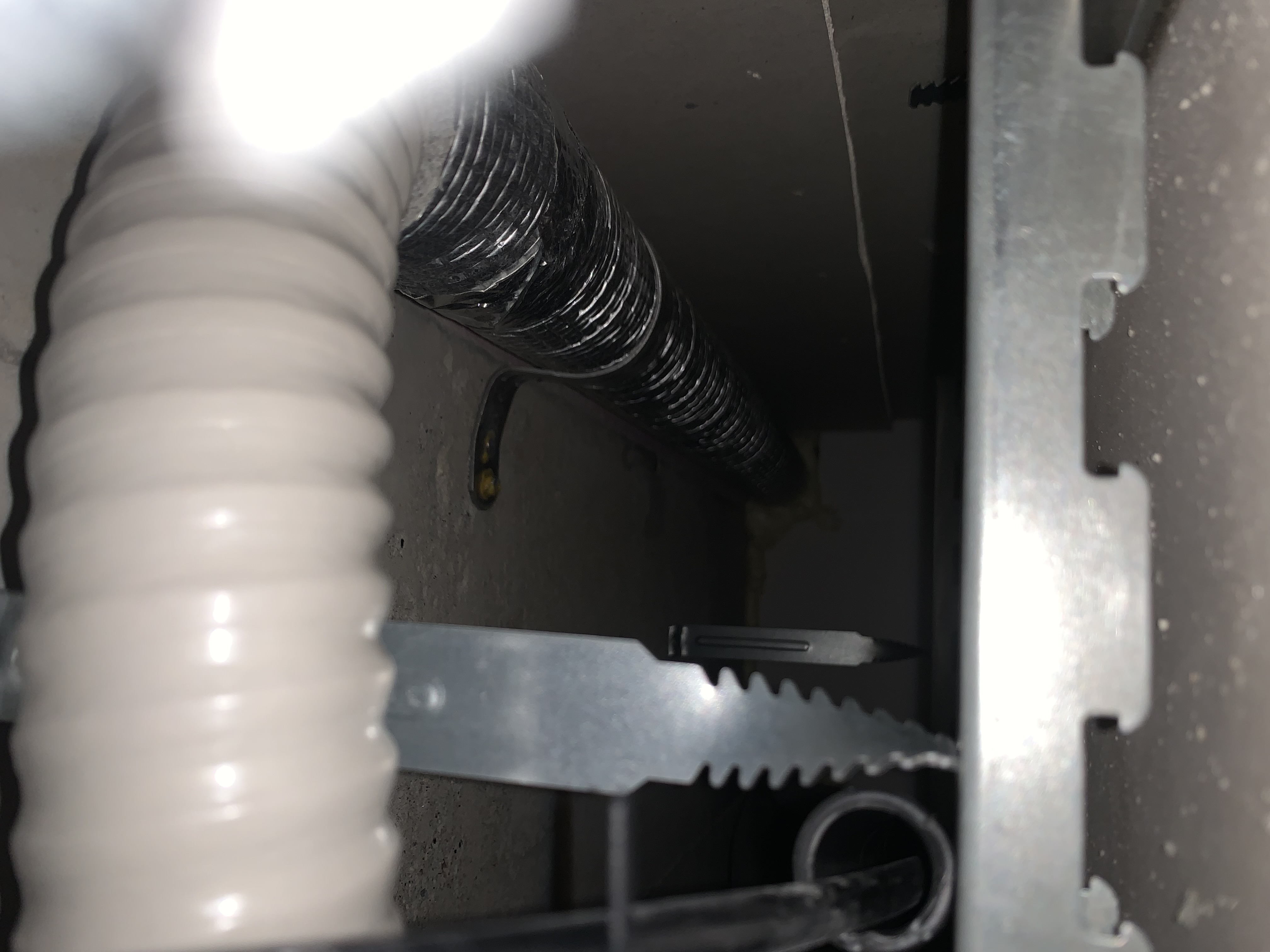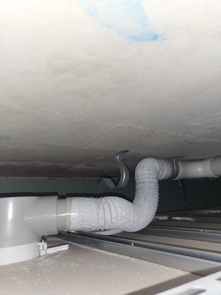 사진에 보이는 것이 환기장치의 공기를 위한 배관으로 보이는데요. 이 배관이 벽을 관통해서 들어온 곳이 있을 것입니다.