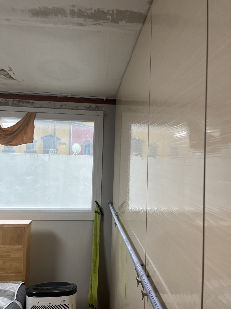 다른방은 샷시 물샘 동일하나 안방천장만 문제를 겪고 있습니다. 도배벽지 뜯어내면 석고가 같이 뜯어져 구멍이 날것이라 생각합니다.