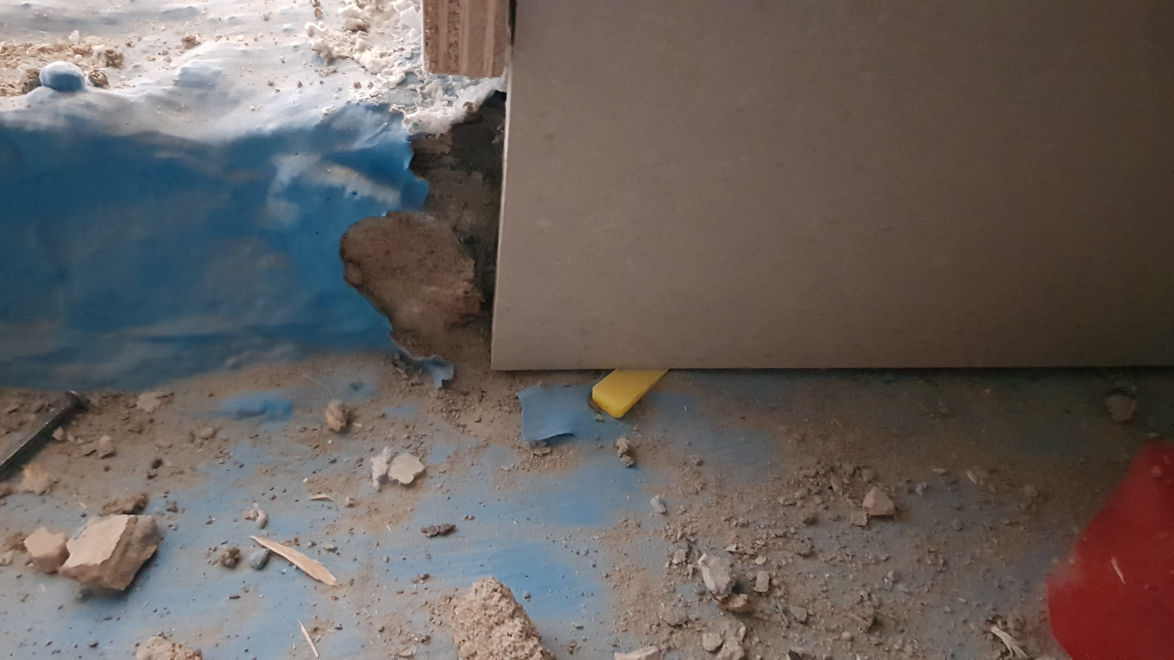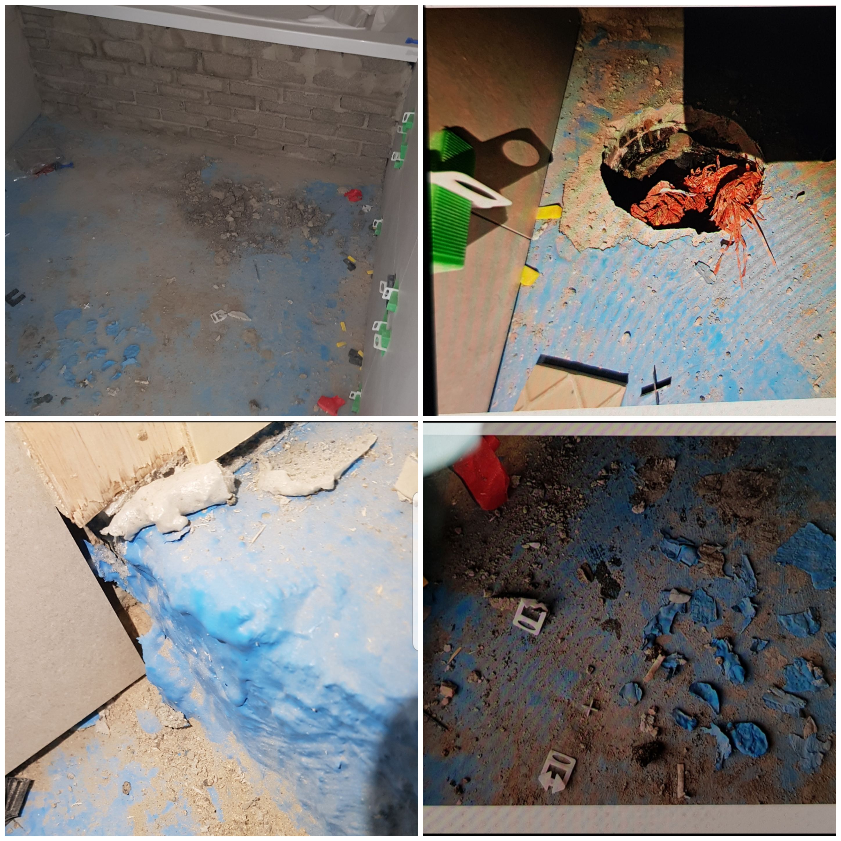 화장실 3차 액방하였구요. 타일 하루 작업후(벽면만 시공) 현장 방문하니 하늘색 방수칠이 뜯겨져 그 조각들이 바닥에 있었어요(철거를 거칠게 해서 모서리부분이 울퉁불퉁했음)