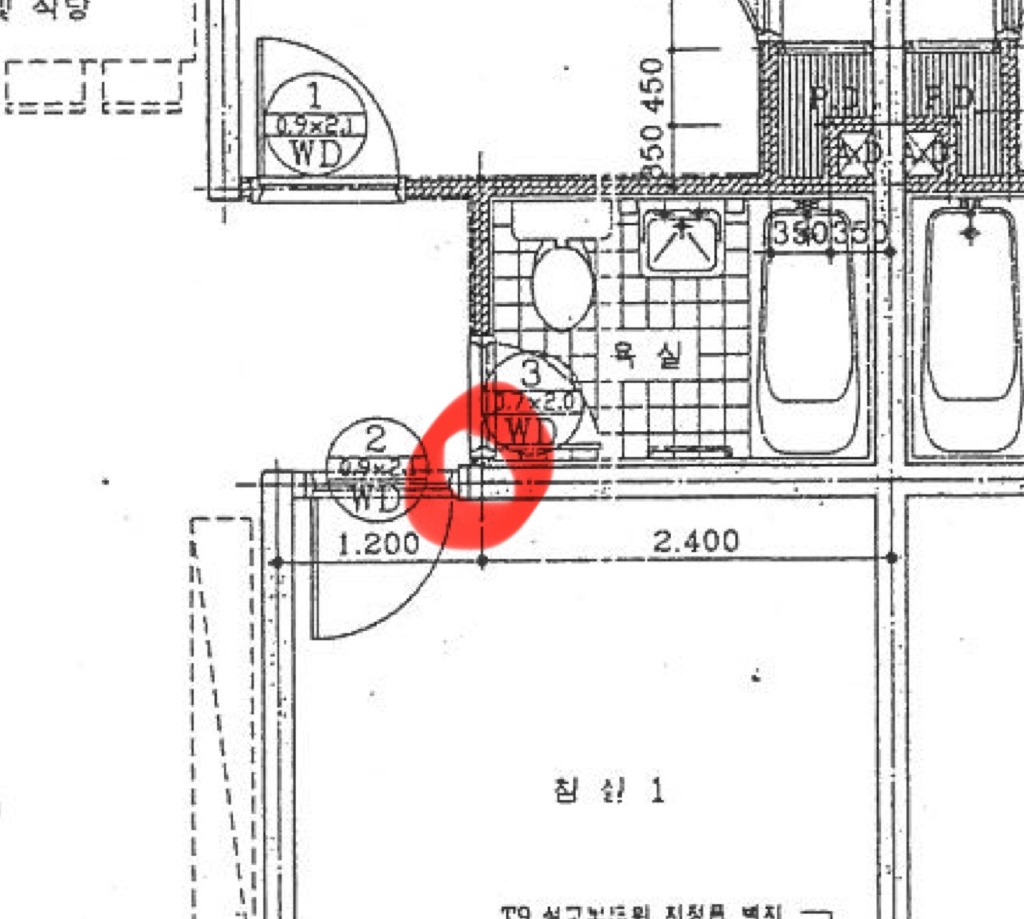 평면도에서 표시한 부분 누수가 생겨 확인해보니,