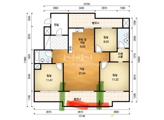 (저의 집은 탑층 바로 아랫층이고, 저희집과 윗집 모두 베란다는 확장, 빨간색 부위에 에어컨 설치)