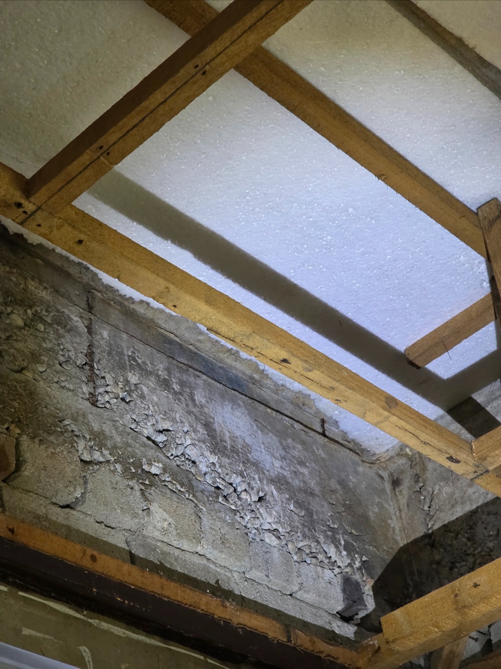 - 천장에 합판이 붙어있는데 접착력이 강하지 않게 붙어있어서 뜯어냈거든요? 근데 뜯으면서 보니까 합판이 노출되지 않은 곳은 합판을 대고 그 위에 시멘트 덧방?처럼 되어있습니다.