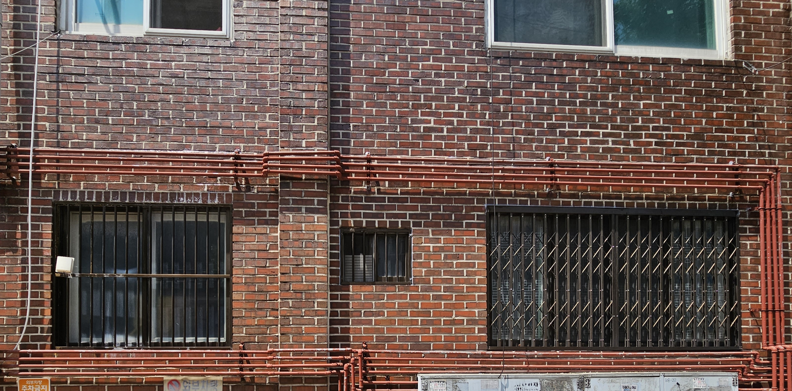 빌라의 외벽 적벽돌과 내벽 콘크리트 사이 단열재 틈을 통해 물이 흐르는 것으로 추측됩니다.