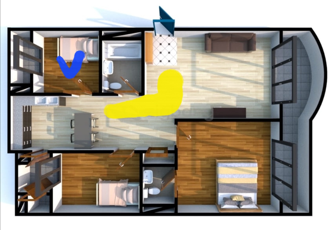 지난 12월 아파트 천장중 화장실 앞쪽과 옆쪽으로 (노란색부분 천장위치) 우는 증상이 발견되었고 일주일후쯤 화장실 옆방(파란색 체크) 천장과 침대쪽 벽에서 물이 엄청 쏟아졌습니다.