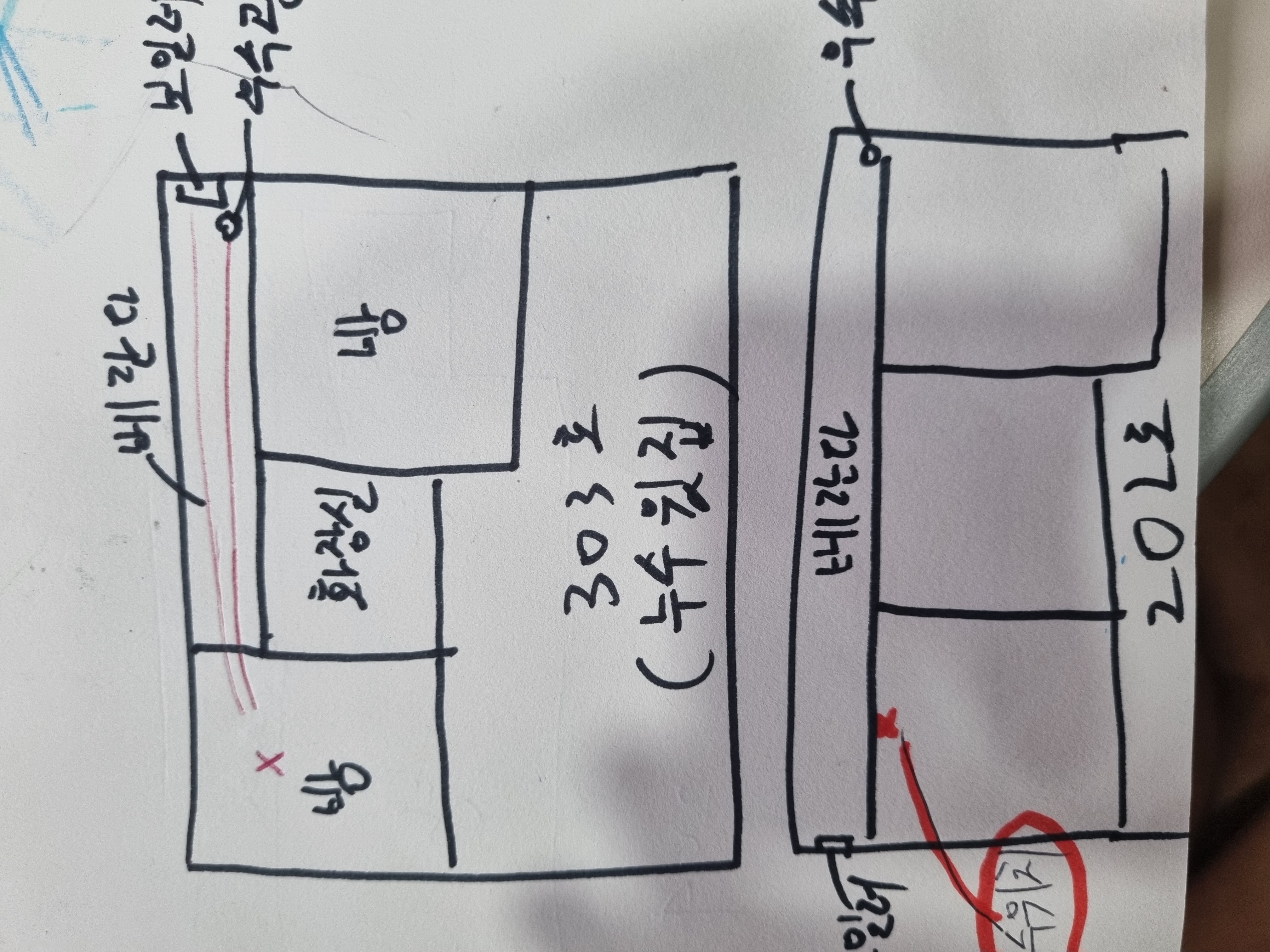 303호는 누수가 있는 방이 확장 상태이고, 우수관 쪽으로 보일러가 있습니다. 비가 올 때는 3층 보일러실 및 베란다 확인 못했습니다. 3층서 무엇을 체크해야할까요?  (답변 진심으로 감사합니다.)