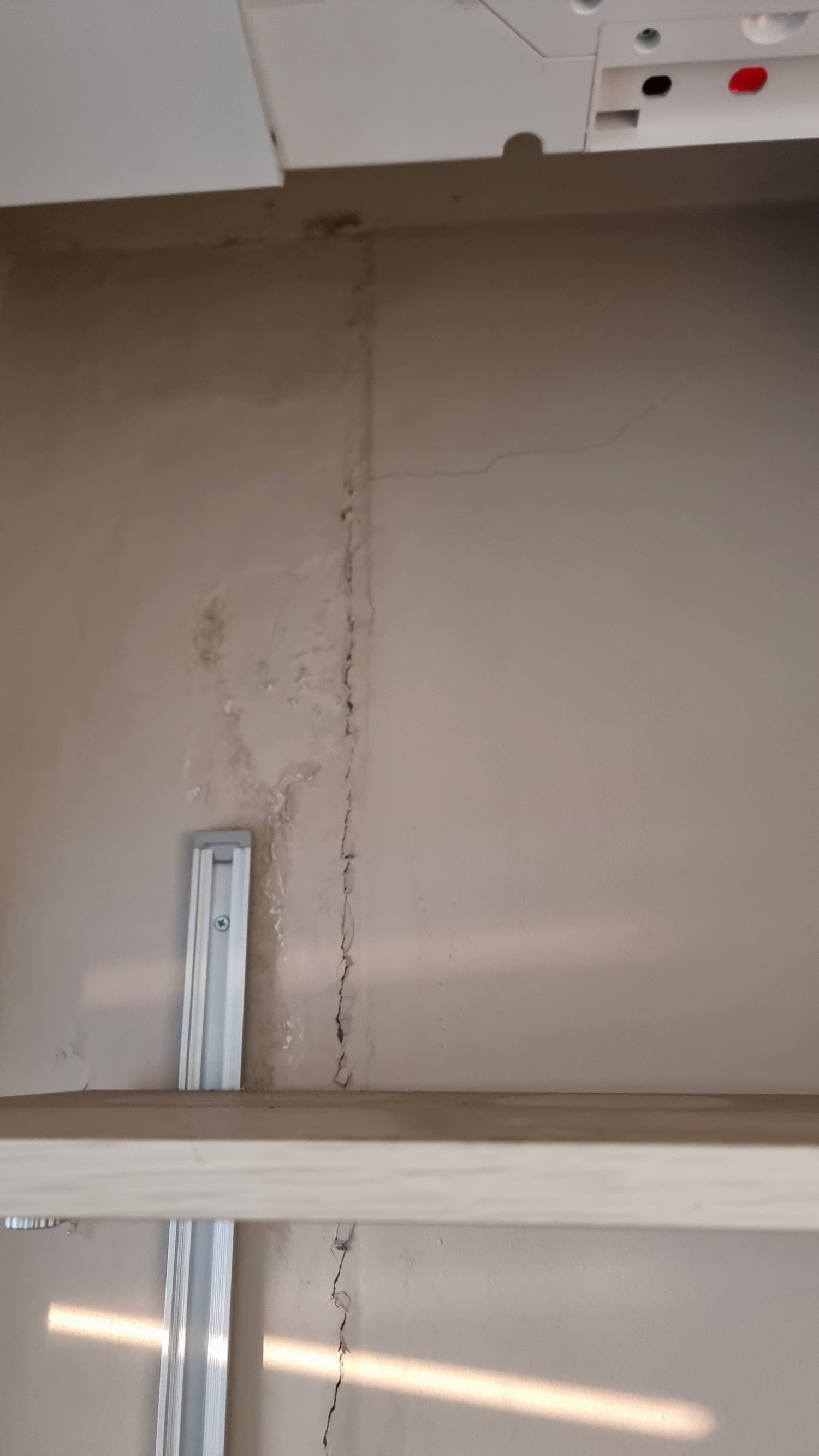 이 부분은 서로 다른 구조방식 (콘크리트와 조적벽)이 만나는 구간이라서, 이 균열이 중대한 하자에 해당하지 않습니다.