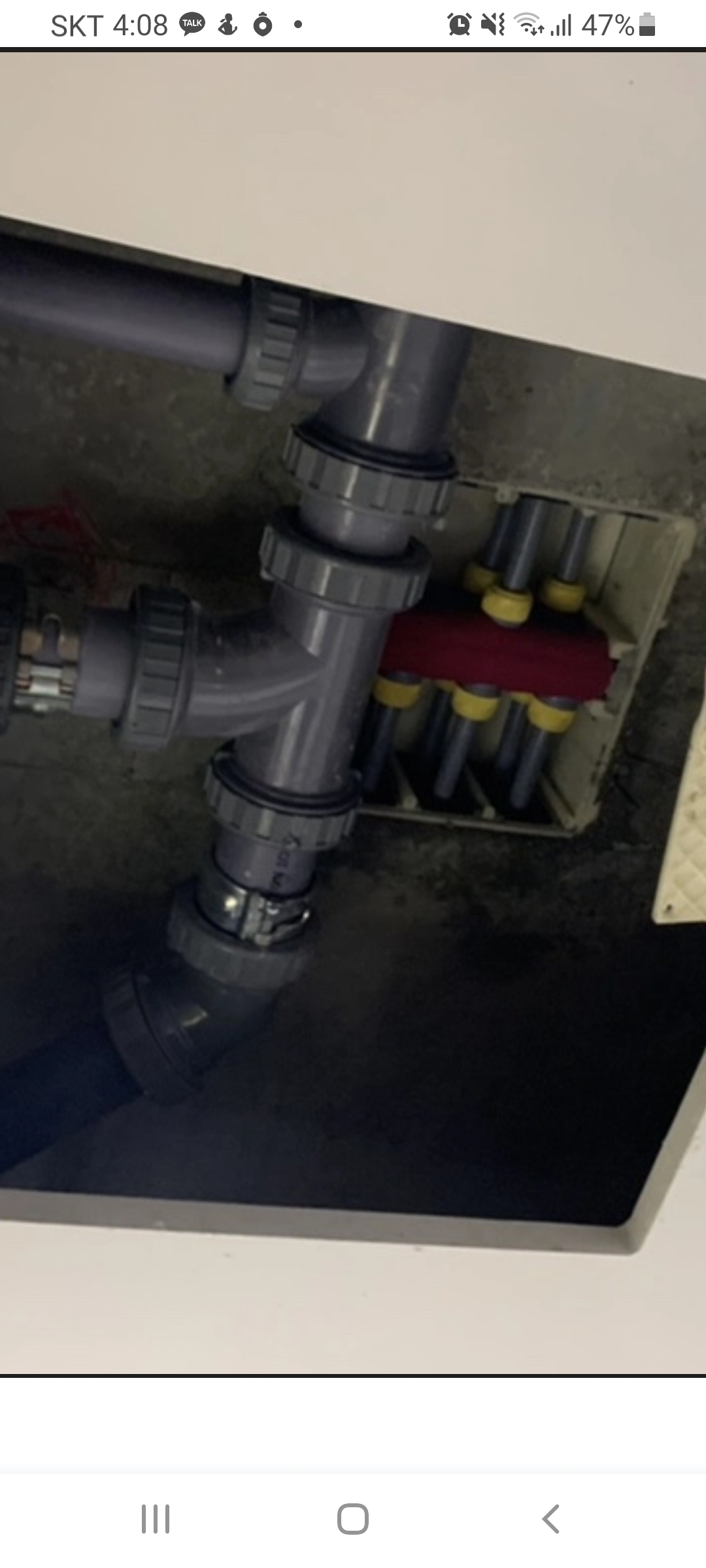 비고) 상기 사진의 PVC배수배관에 누수가 의심된다면 귀 댁 세면대 하부 배수관을 빼고 테스트 해보는 것도 방법입니다. 만일 배수관을 빼고 물을 내렸는데 아랫층에 누수가 없다면 세면대 배수배관이 문제겠지요(이게 맞다면 세면대 배수배관 고무패킹 교체하시고 코킹처리 하심 됩니다.)