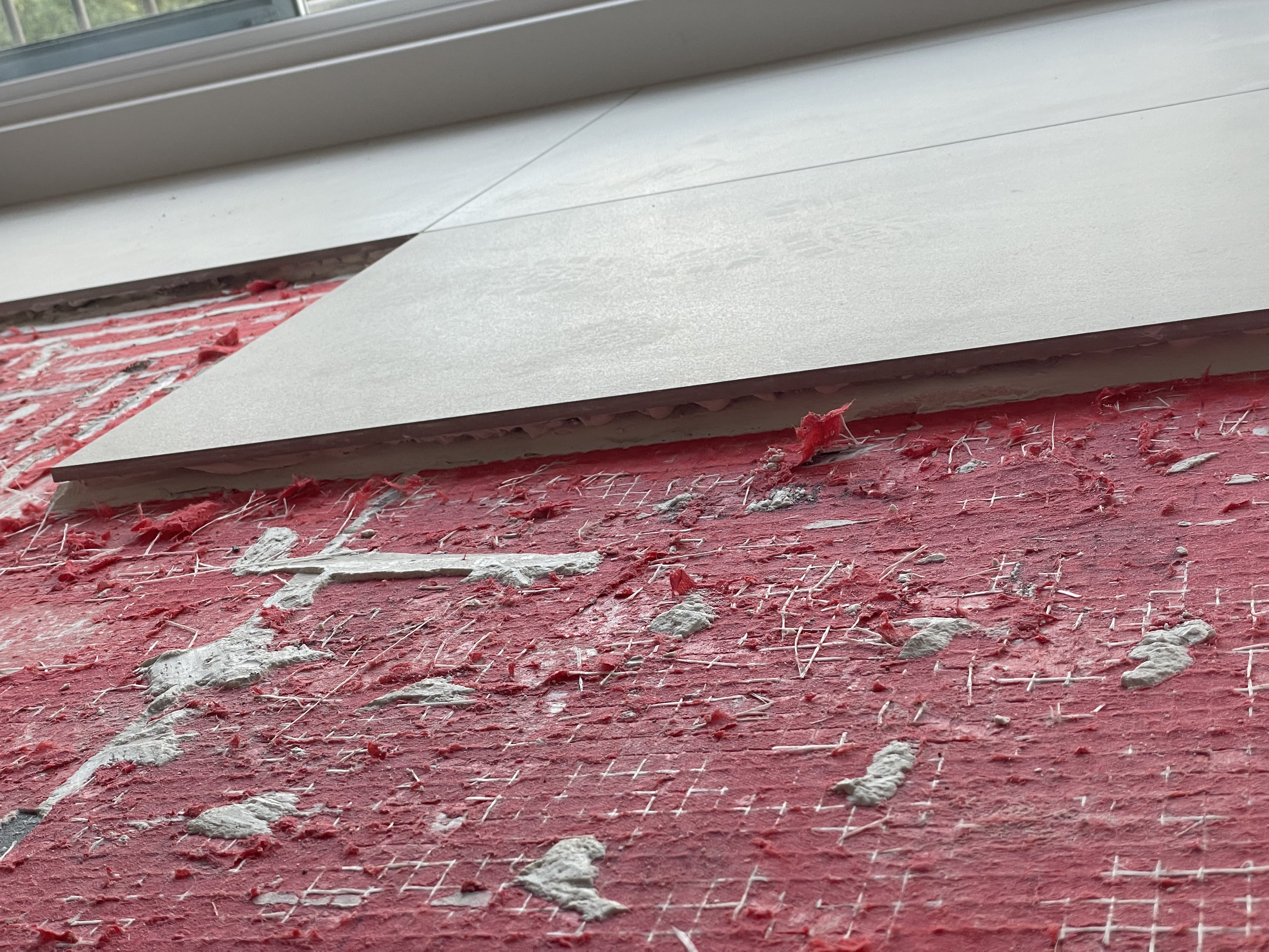 거실쪽 왼쪽에는 저 빨간 매트가 안깔렸는데 전체적으로 다 깔아야 하지 했어야 했나요? 아니면 저렇게 해도 되는건가요? 겨울에 시공을 해 타일 시공시? 확실한건 3월까지 시공 직후  보일러를 계속 틀었습니다. 이건 잘못 시공한걸까요?