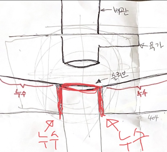 2. 슬리브(빨간색칠)가 시멘트에 고정되어 있고 저희집 우수관을 위로 끼우면 슬리브에 딱 맞게 되어있어서 우수관을 더 이상 위로 밀어올릴 수 없습니다.