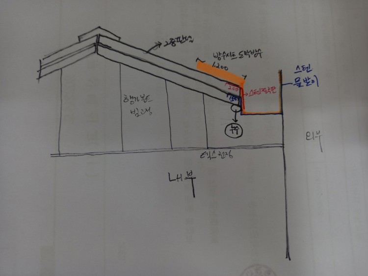시트방수처리후 도막방수까지 했는데도 누수가 생기더라구요 이건 기존지붕층에서 빗물이 타고