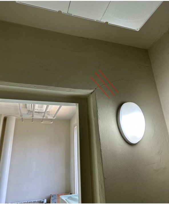 편집한 사진과 같이 문틀 상부에 보강 철근 세 가닥이 빠져서 그렇습니다. 경사방향으로 발생한 인장균열인데, 줄여서 '사인장 균열'이라고 합니다. 내부라서 외부수 유입이 없고 균열이 크게 진행하지 않았기 때문에 구조적으로 걱정할 일은 아닙니다. 그러나 하자는 분명합니다.