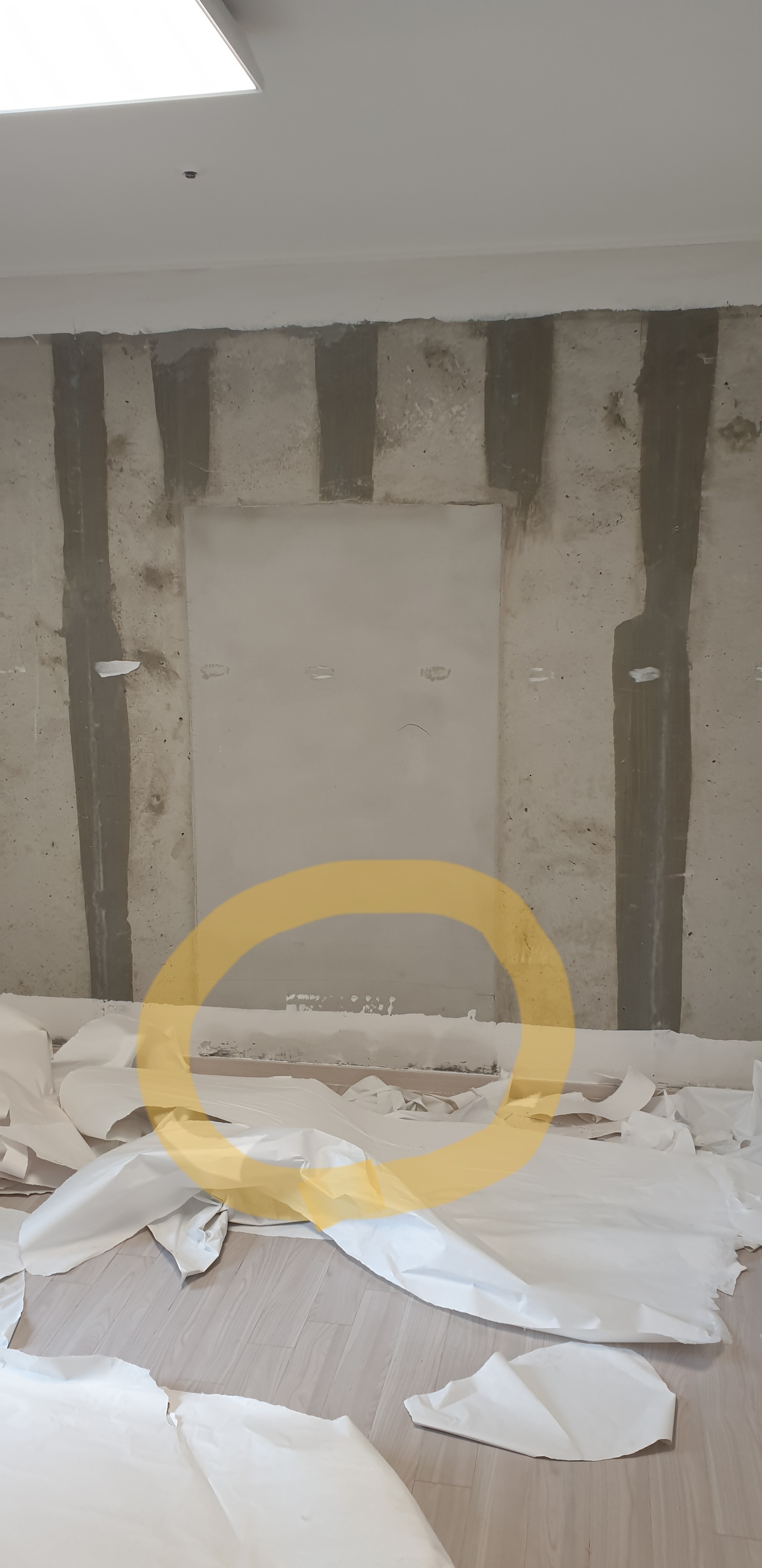 아마도 공사 중에 물이 개입된 것 같습니다. 그러므로 지금 다 마른 후에 마감을 하시면 괜찮습니다.