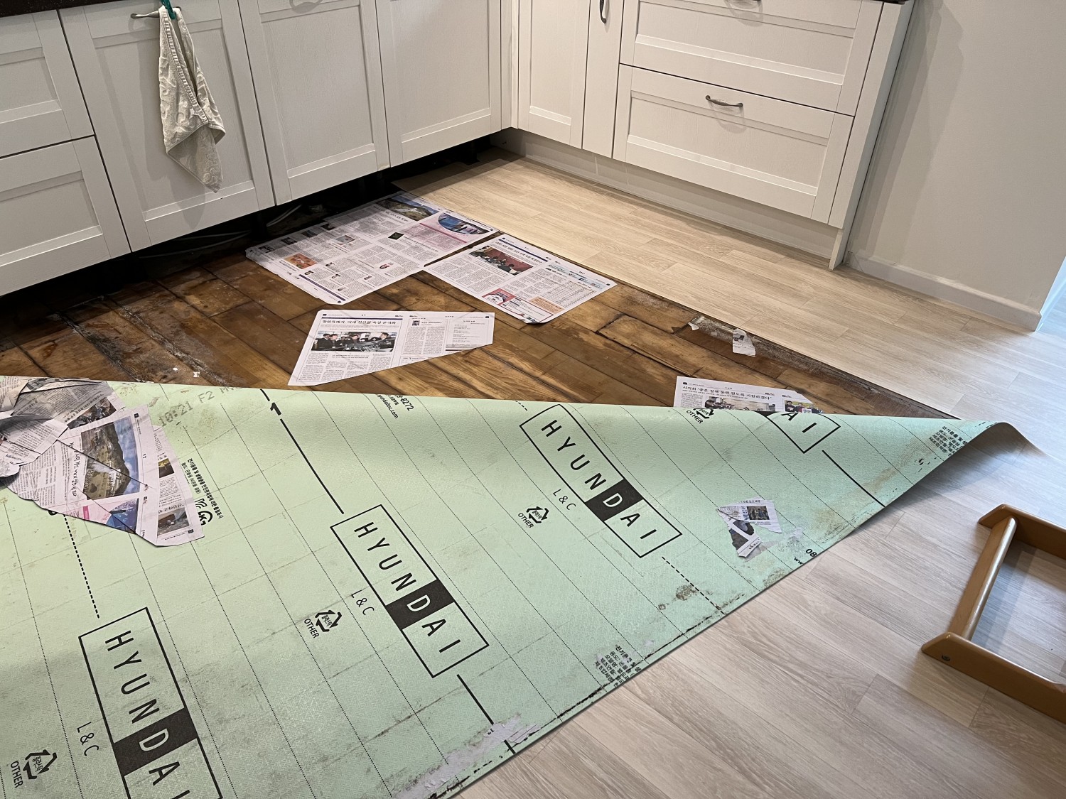 2월 리모델링을 하면서 장판을 걷어내니 마루시공이 되어있고 물이 샌 흔적이 있다고 하여 정수기 물 샌 것때문이라 생각하고 장판으로 덮었습니다