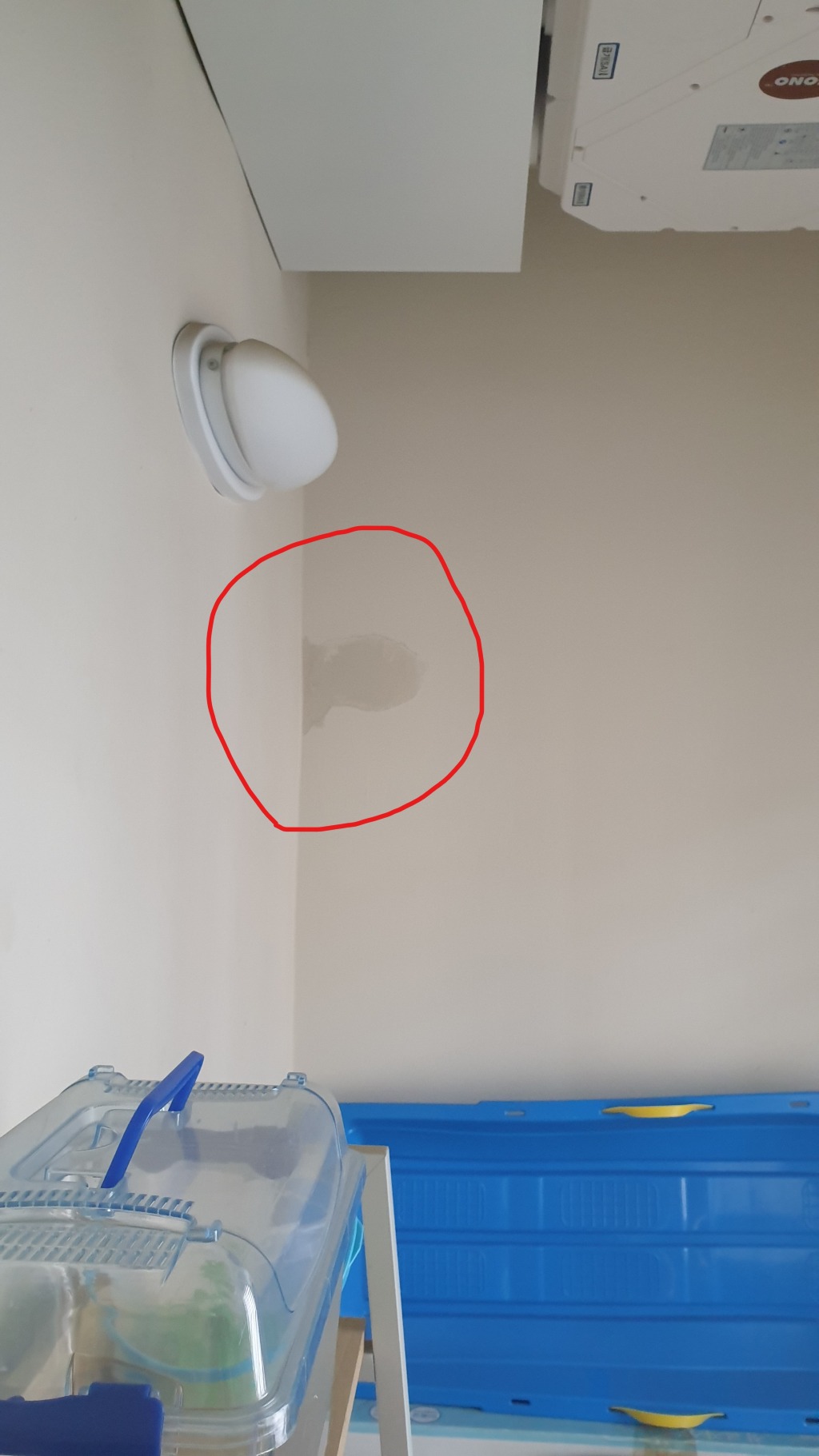 안방에도 실외기실 처럼 천장에서부터 물이 젖은 흔적은 없고 (관리실에서 내시경을 넣어 확인) 오른쪽 실외기실이 젖은 위치와 거의 같은 높이로 약 60센티미터 간격으로 두군데 , 중간엔 약 30센티미터 간격으로 한군데, 그리고 다시 왼쪽으로 60센티미터 간격으로 두군데가 더 동그랗게 벽지가 젖었습니다. 천장부분과 천장과 만나는 모서리으로부터 젖은 흔적이 없기에 윗세대의 누수라고 확신하기도 어렵고 해당벽 뒤에는 외벽이 아닌 실외기실과 마찬가지로 옆라인 세대의 안방이 거울대칭구조로 마주하고 있으며 콘크리트 벽 내부에는 어떠한 배관도 매립이 되어있지 않다고 관리실에서 도면확인으로 답변주셨습니다. 관리실 직원도 다녀가고 단열 누수 업체도 다녀 갔지만 벽 중간에 띠 모양처럼 간격을 두고 젖어드는 원인을 모르겠다고 합니다. 참고로 윗집 배관검사도 했는데 이상 없다고 합니다. 저희집은 시스템에어컨이 아니고 스탠딩 에어컨이라 천장으로 에어컨 배관이 지나가지도 않습니다. 지금은 젖은 부위 벽지를 떼어놓은 상태인데 벽지를 떼고서는 벽에 물방울이 맺힌다던지 벽으로부터 물자국이 생긴다던지 하는 현상은 없고 보기에는 멀쩡해 보입니다. 해당부위를 손바닥으로 갖다대면 축축하지는 않는데 다른부위보다 약간 차가운 느낌이 들긴 합니다.