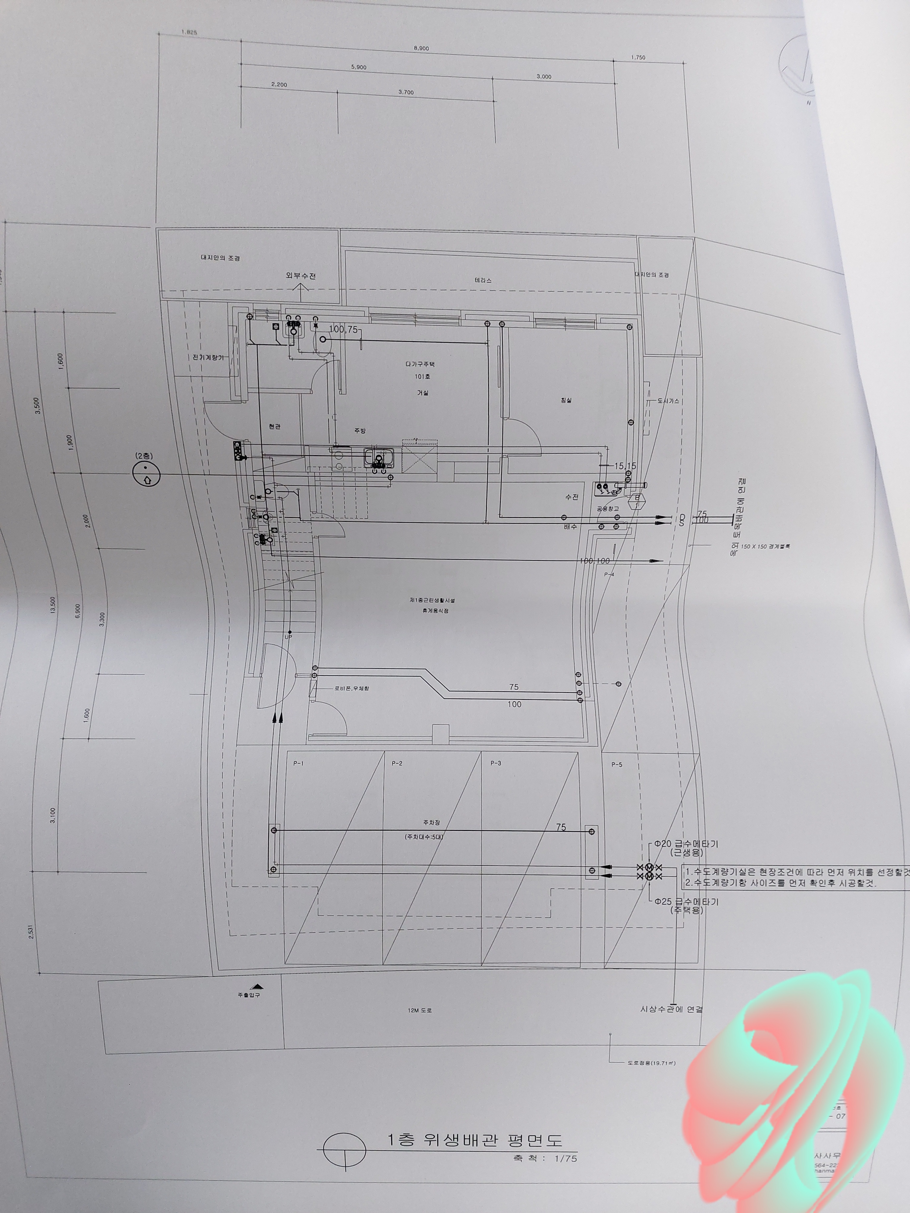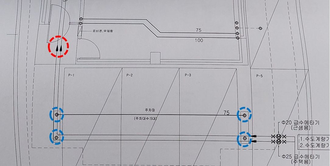 먼저 아래 표시된 붉은 색 원형을 보시면, 수도관 두 개가 현관 앞을 지나도록 되어 있습니다. 물론 이 도면대로 실제 시공이 된 보장도 없고, 그럴 확률도 적긴 합니다.