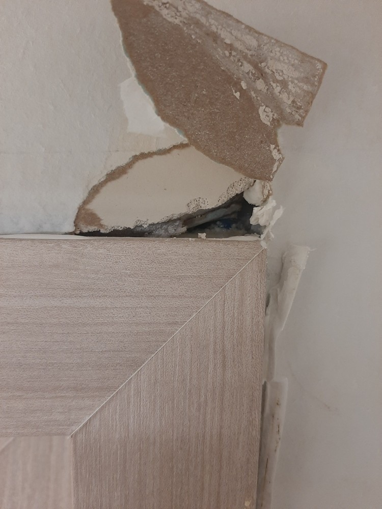 정상적인 보수라면, 석고보드의 일부를 절개한 다음.. 내부가 왜 비었는지를 확인 후에, 폼으로 (눈으로 보면서) 충실히 채운 후 다시 석고보드로 마감을 해야 합니다.