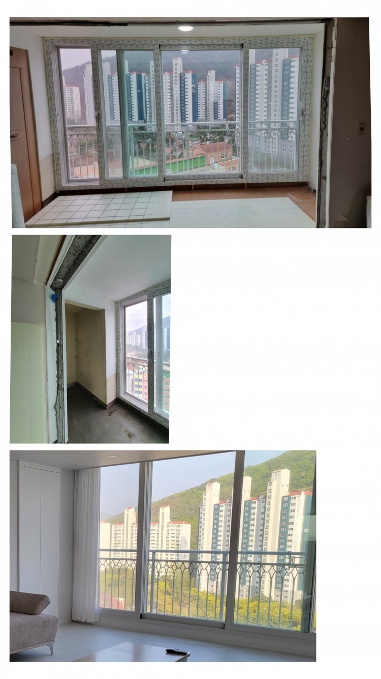 거실 면적 넓게 사용하고 싶어 거실확장을 하면서 이중창,난방,단열,터닝도어 모두 진행했습니다.