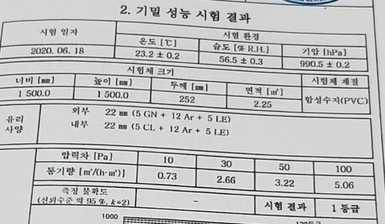 비교하던중 두 자료의 기밀성 1등급은 조건 충족을 하는데 기밀 성능 수치는 서로 (시험성적서와, 성능관계내역서) 다르게 나왔습니다.