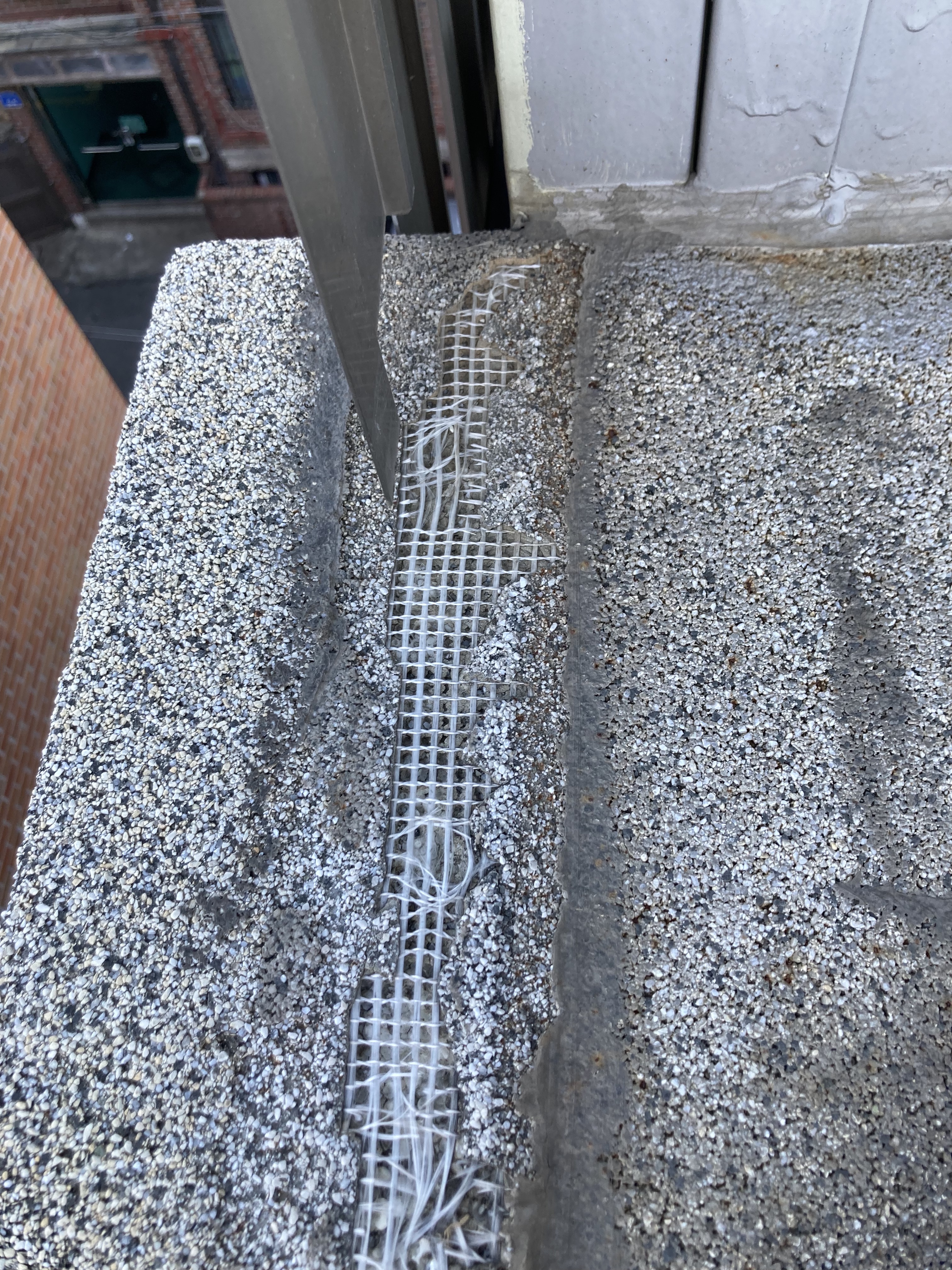 1)사진 중앙에 창틀과 미장면 경계부분에 시멘트가 떨어지고 뭔가 안쪽의 철근같은게 보이는 부분은