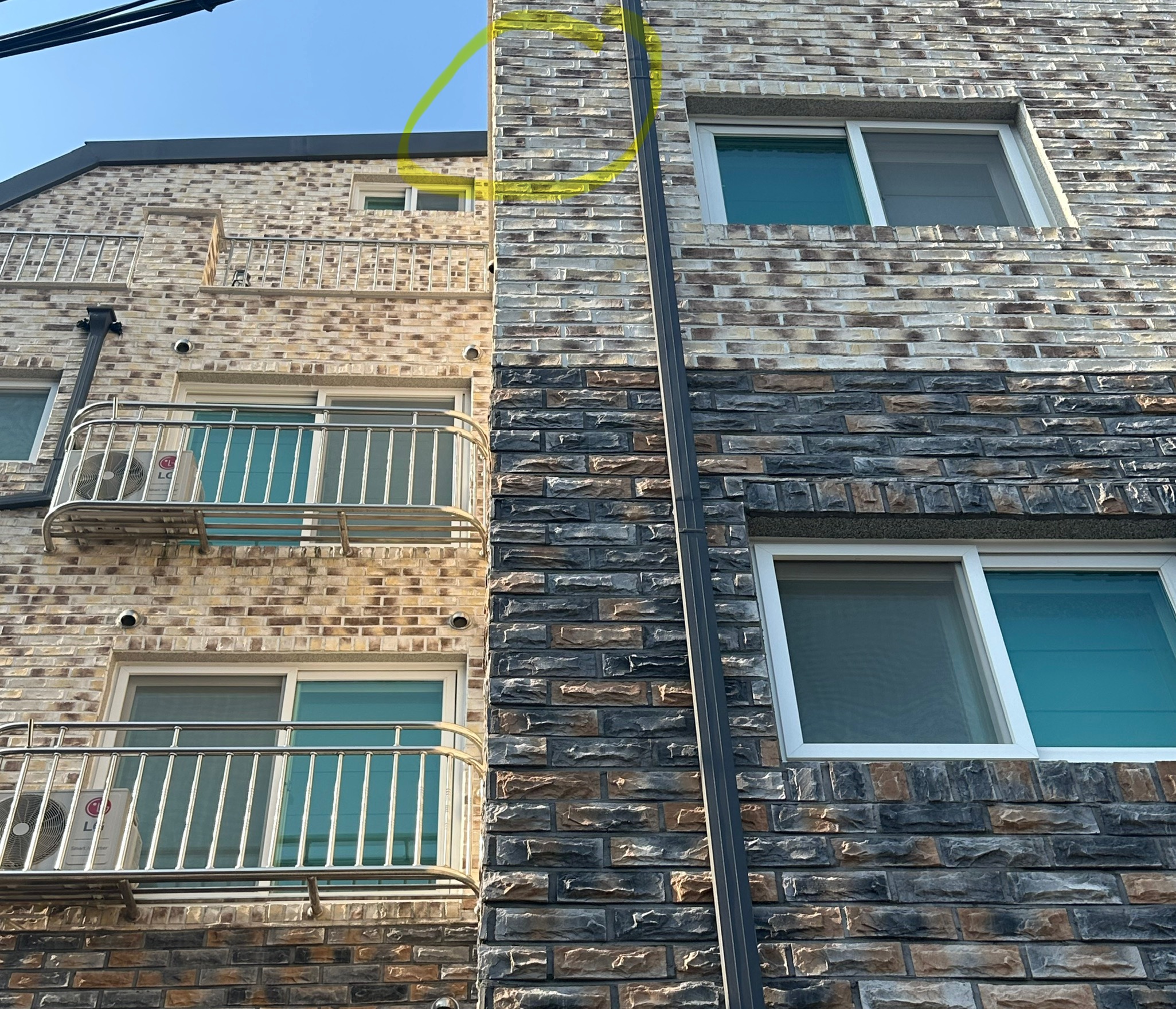 외벽 사진입니다 바로 벽 옆은 옆집인데요 저 새는곳 위치가 4가구 꼭지점이 맞대는 부분이라 이부분도 참 어렵네요