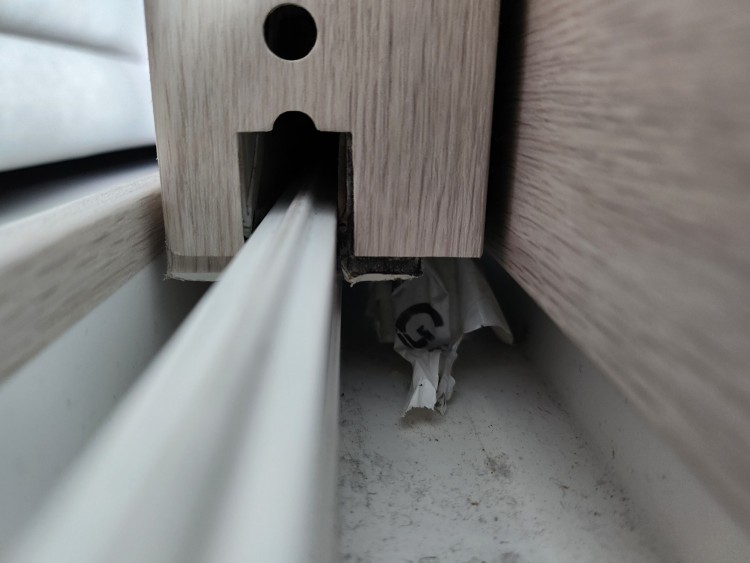 보호테이프가 다 벗겨지지 않고 약간 남아있는 상태로 하자는 아닙니다. 저부분이 창틀이 서로 닫히는 부위에 풍지판이 조립되면서 보호테이프가 낑기는 부위입니다. 창을 반대로 열어서 보양테이프를 잘 잡아댕기면 떨어져 나옵니다.