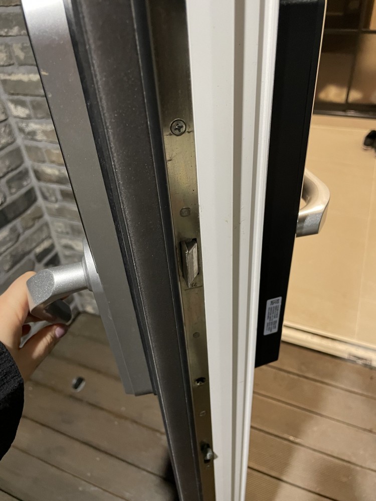 집에서 현관문을 열고 밖으로 나간 후, 밖에서 현관문을 닫으면 측면의 걸쇄가 자연스레 들어가지 않으면서 현관문이 닫히지 않습니다.