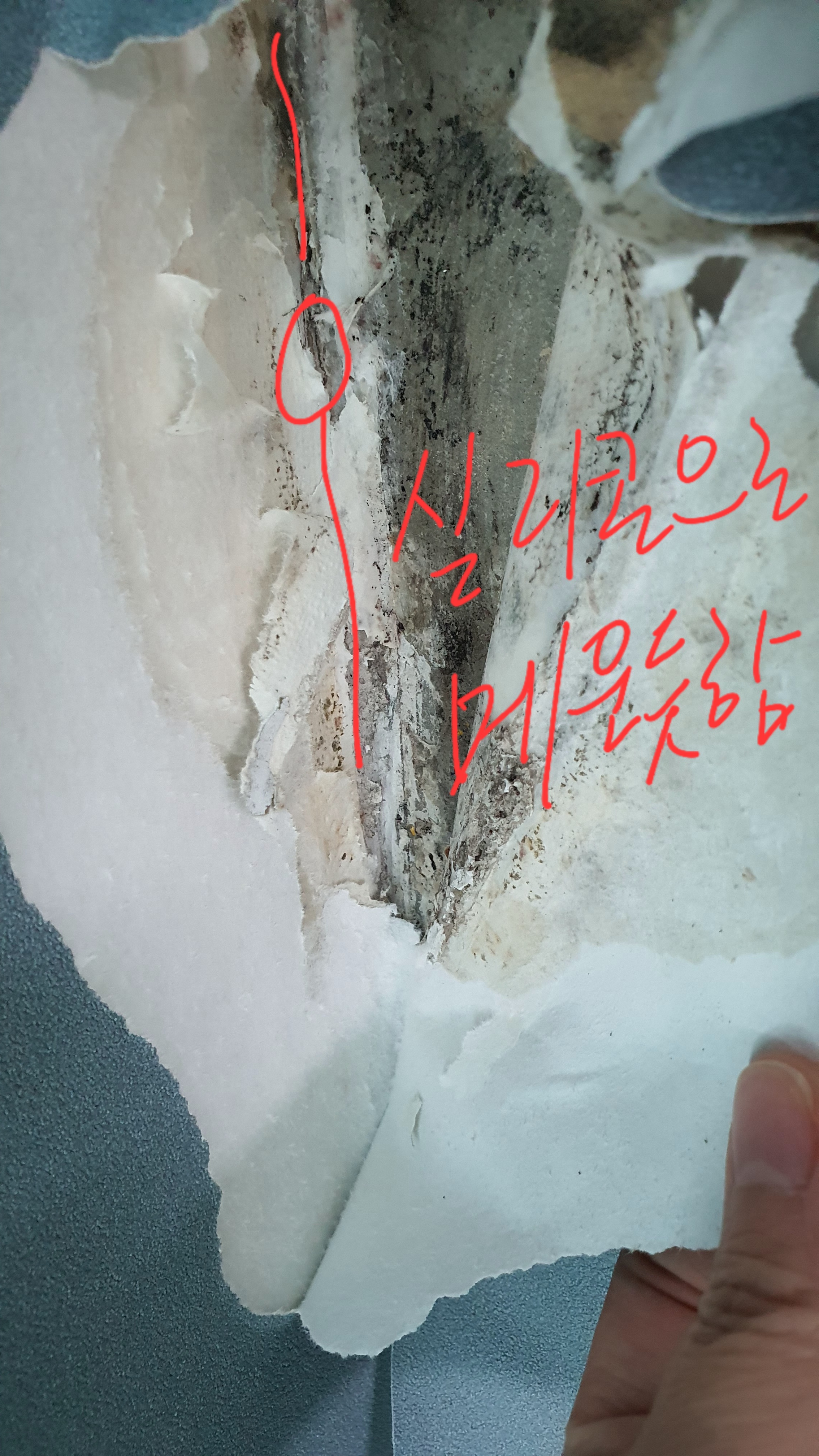 저희가 처음 시공할때 그부분 채워주시라고 요청을 드렸음에도 다 채웠다고 하시고는 저렇게 비워둔 상태로 실리콘으로 마무리를 하셨고 벽지를 제거하는과정에서 작은 틈이 보여서 칼로 열어보니 속이 텅 비었고 그쪽으로 냉기가 느껴질 정도로 뿜어져 나오더라고요.