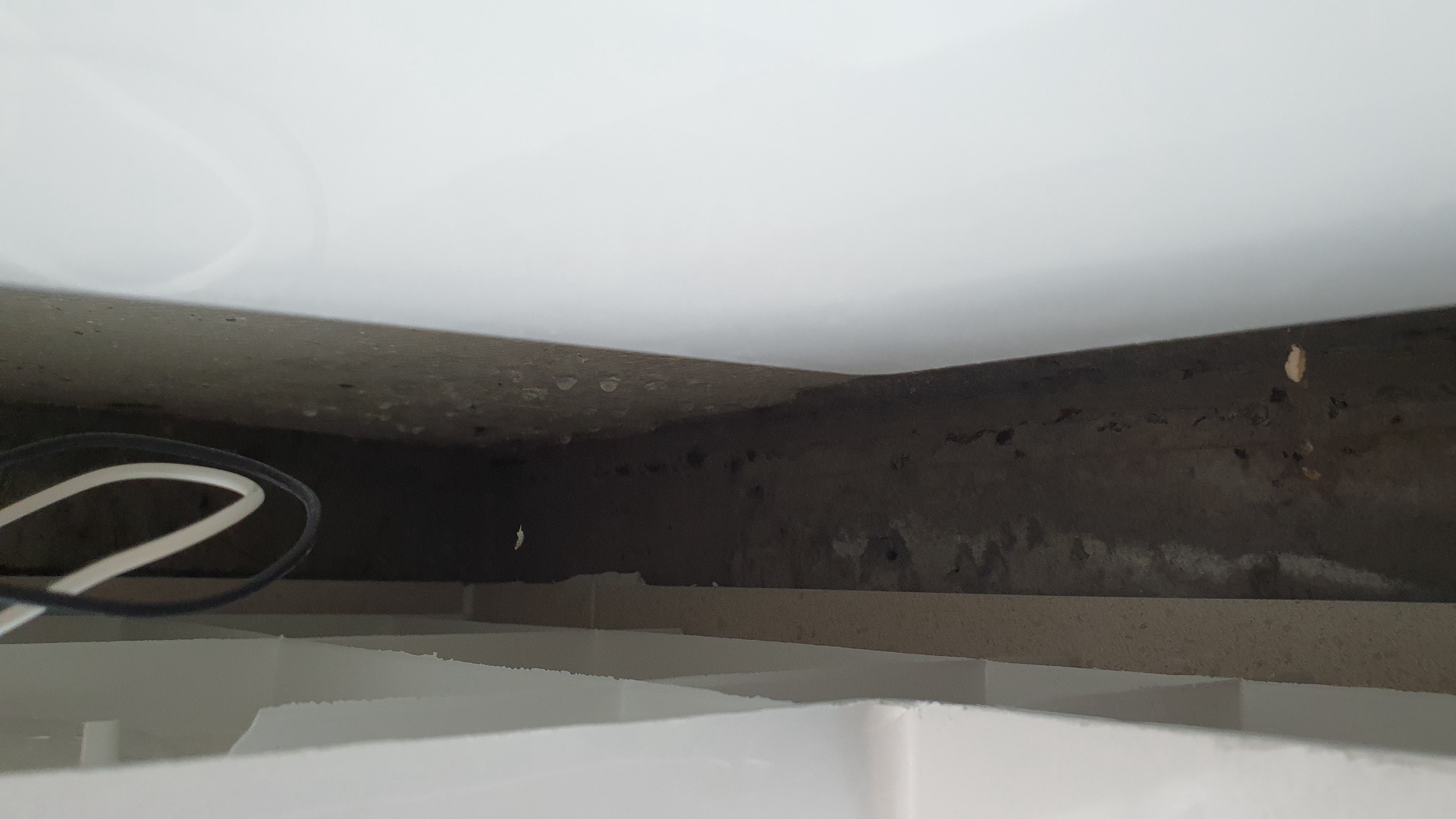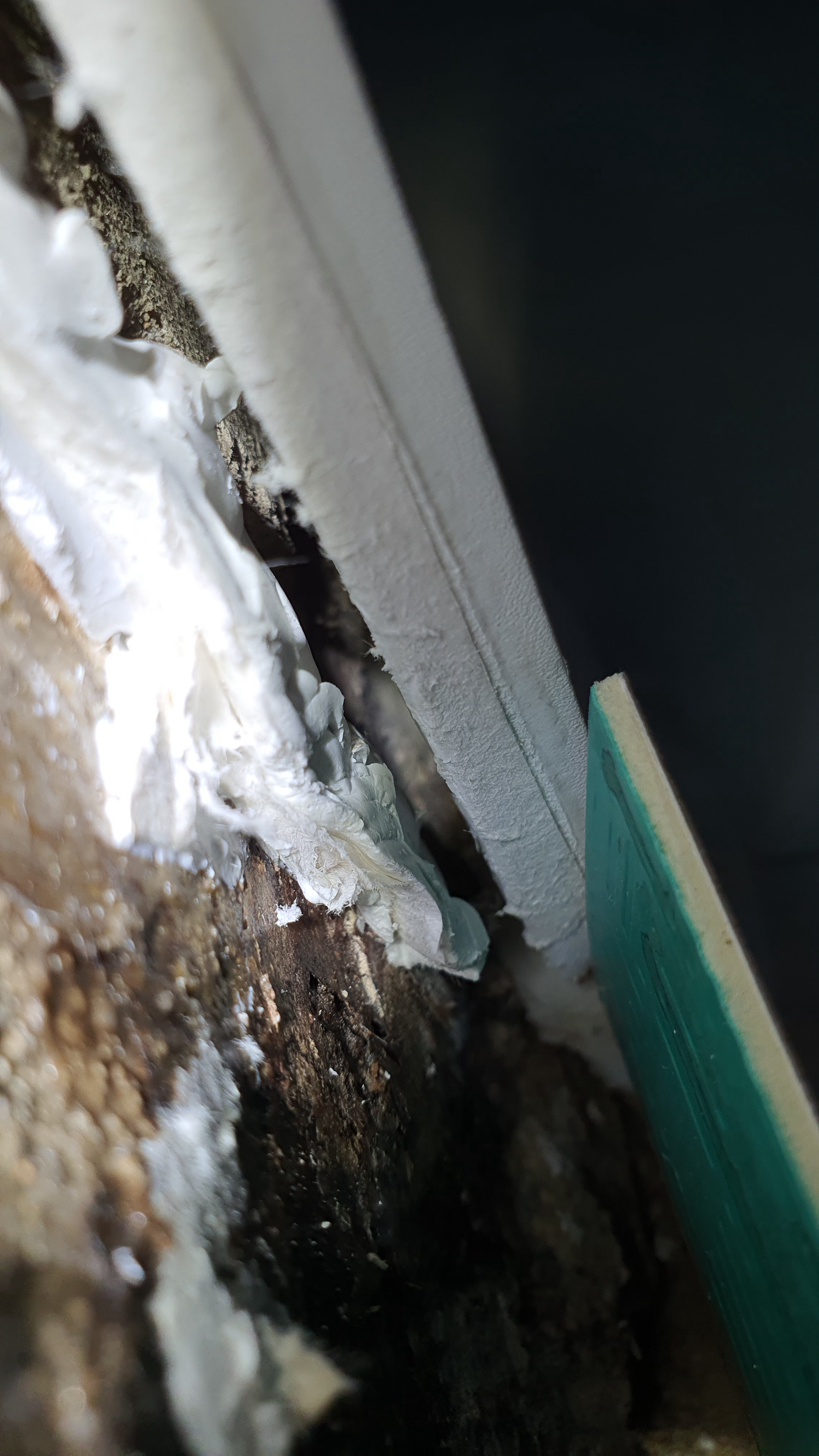어제 바닥재와 벽지 연결부분이 곰팡이가 생겼다고 말씀드렸는데 낮에 곰팡이 생긴 실크벽지 잘라내고 곰팡이제거제를 발라두었습니다. 그러는 과정에서 이번에 창호시공 헛점이 확인되었고 사진상으로 보여지는것처럼 내부가 저렇게 비어있는 상태입니다.