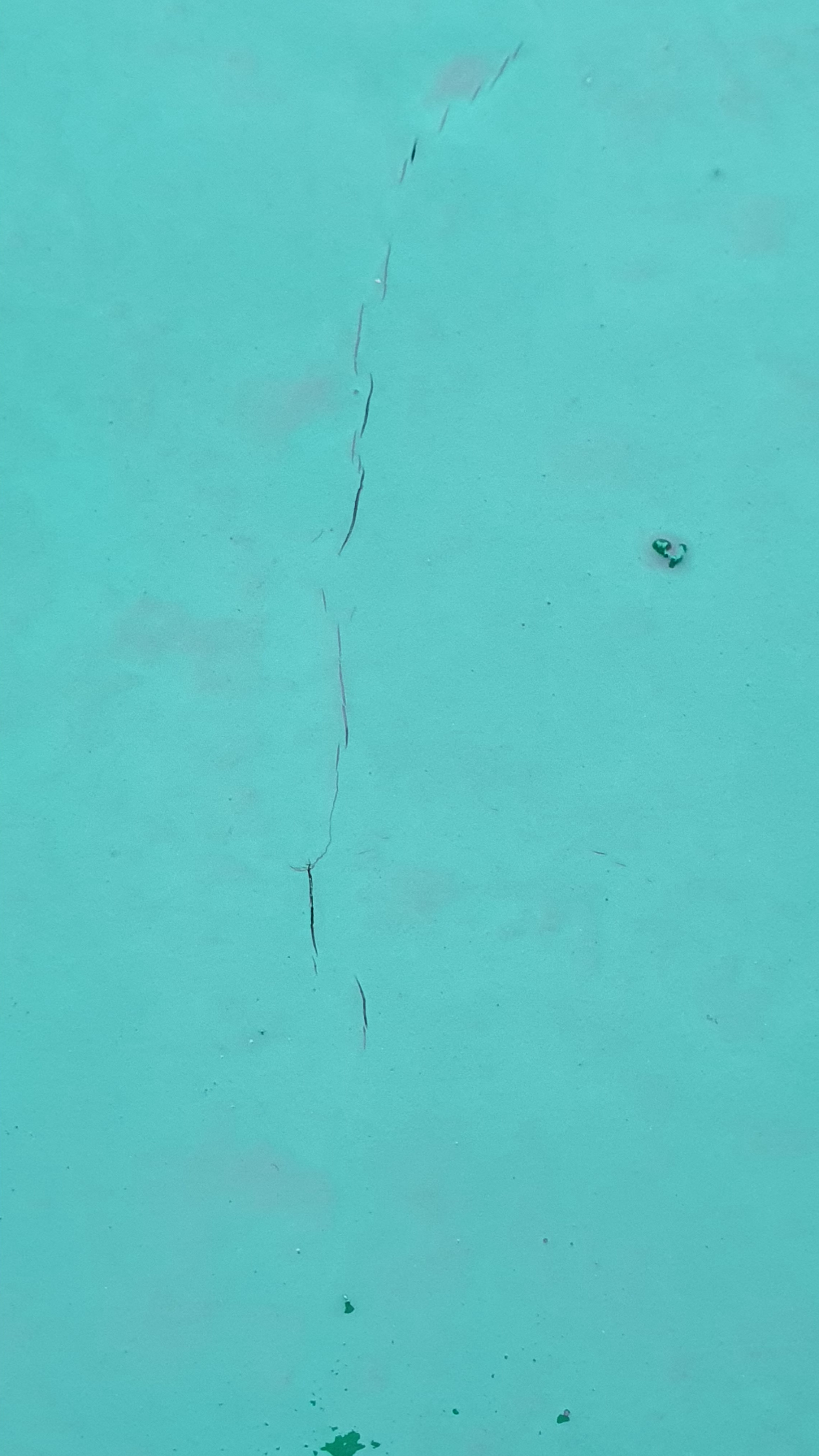 그럼 그 물이 고이는 곳을 걸레로 닦아서, 녹색 표면에 균열이나 들뜸이 있는지 봐주세요.