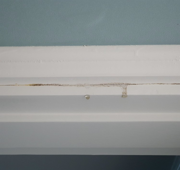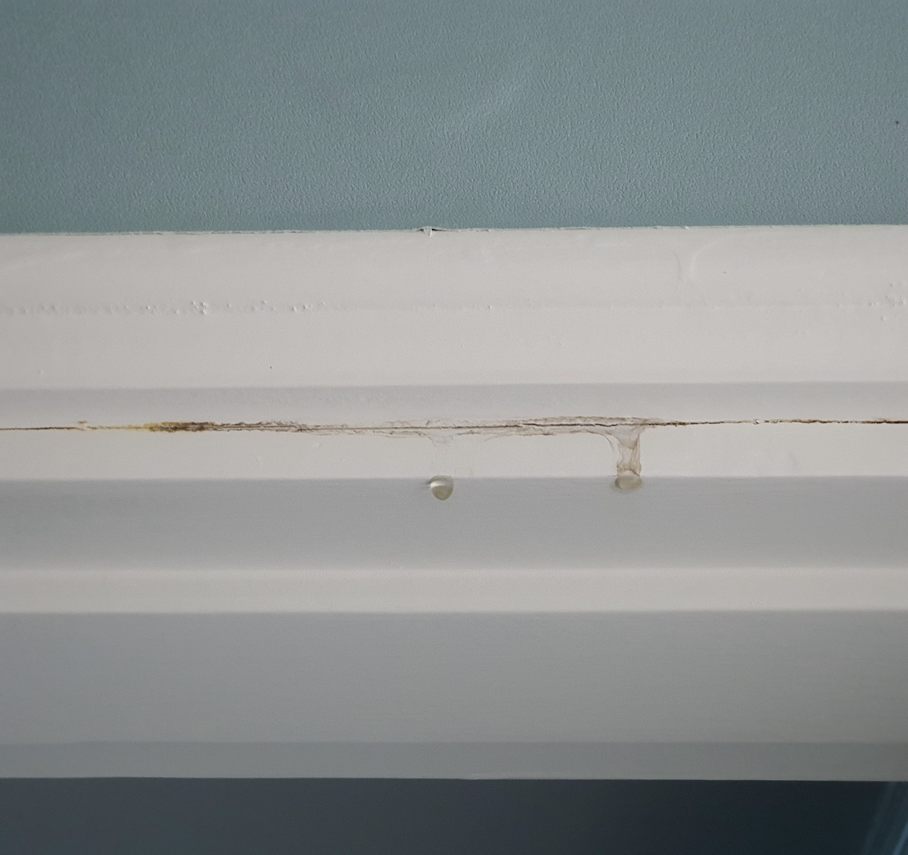 연휴를 보내고 돌아오니 문 틀 위쪽과 옆쪽까지 물이 흐른 흔적이 남아있고 여전히 떨어지지않지만 맺혀있긴합니다.