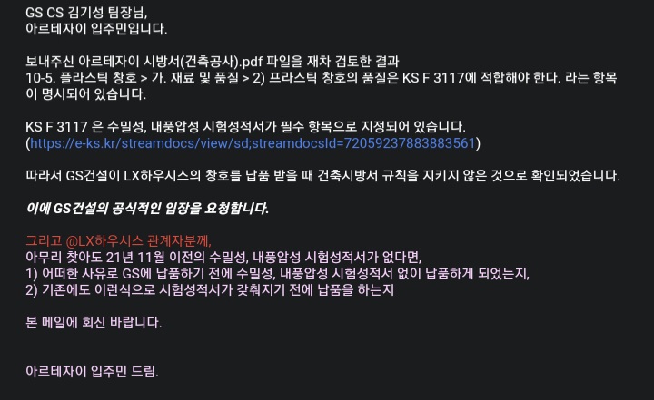 전면 재시공을 요청했으나 불가능하다는 답변이 와있는 상황이고요. 오늘 관리자님의 조언으로 수밀성, 내풍압성 시험성적서 없이 납품, 시공한 상태인것이 발각되어 GS건설, LX하우시스에게 입주민들은 더욱 반발하고 있습니다..