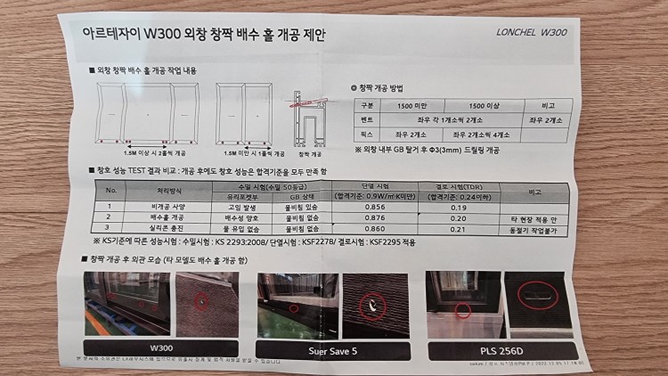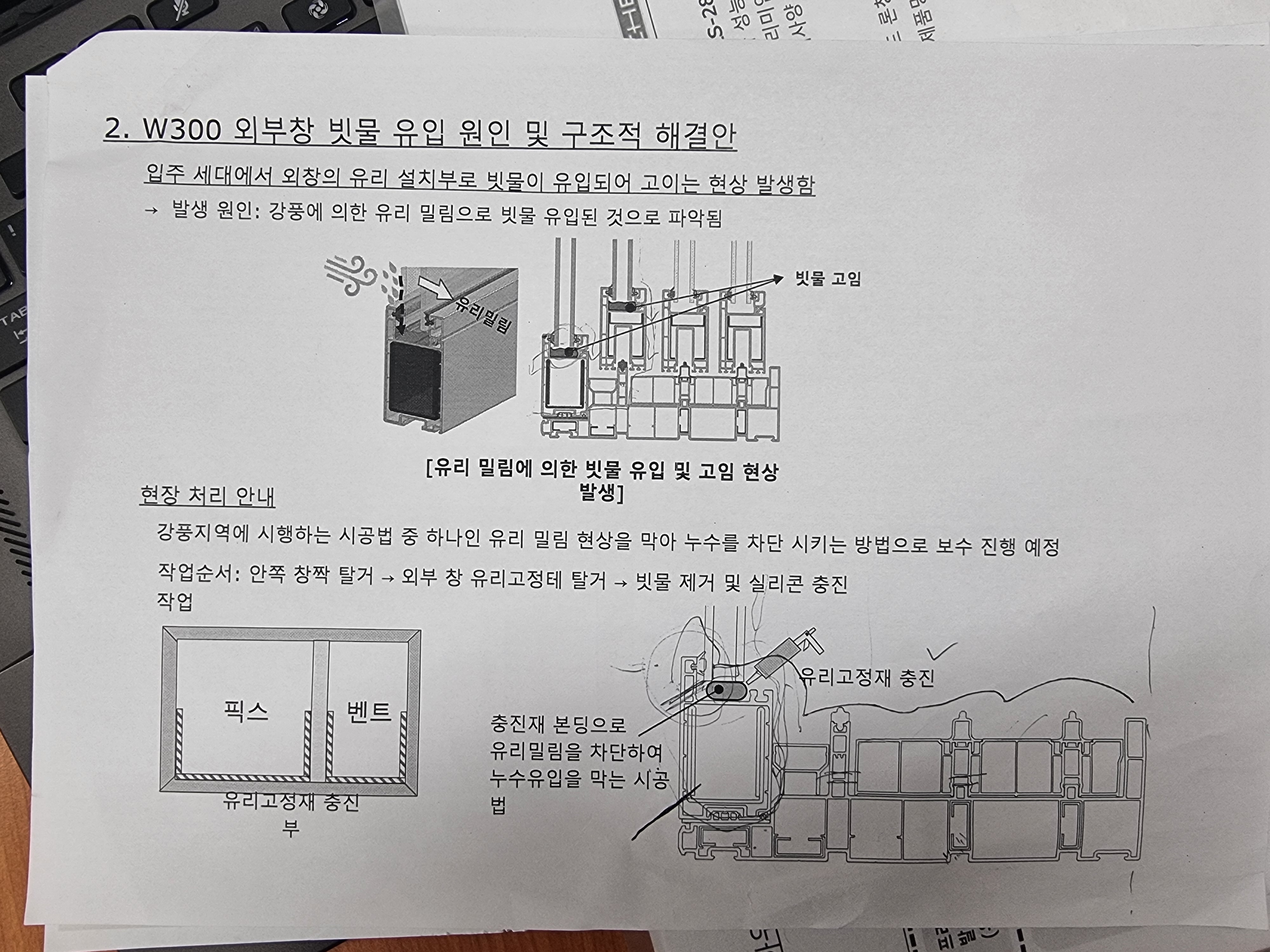 W300을 개발한 LX하우시스는 바람이 불면 창이 흔들리고 그로인해 빗물이 창짝 안으로 들어가게 되고, 그게 내부로 누수가 발생한다고 합니다.