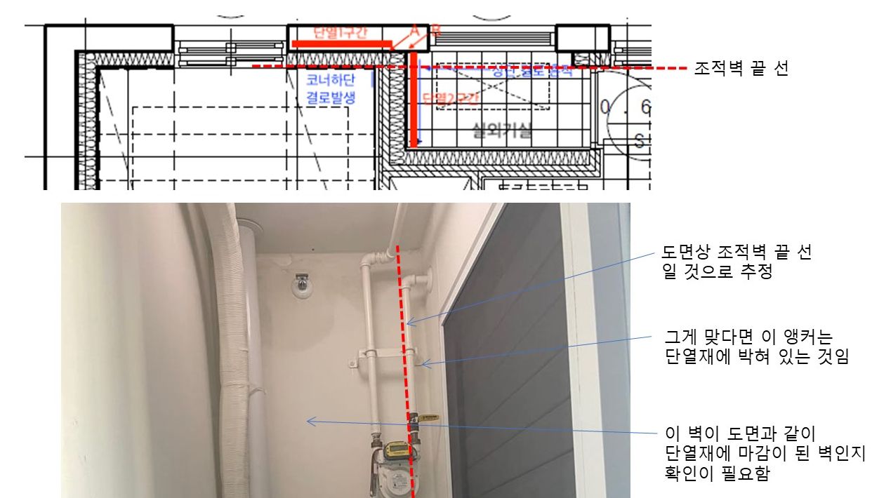 • 시공사 주장: 도면대로 다 시공을 했고 실외기실과 맞닿는 콘크리트 벽면은 콘크리트에 단열성분을 첨가해 시공하므로 원래 단열재가 들어가지 않아 추가적인 하자보수는 어렵다는 답변