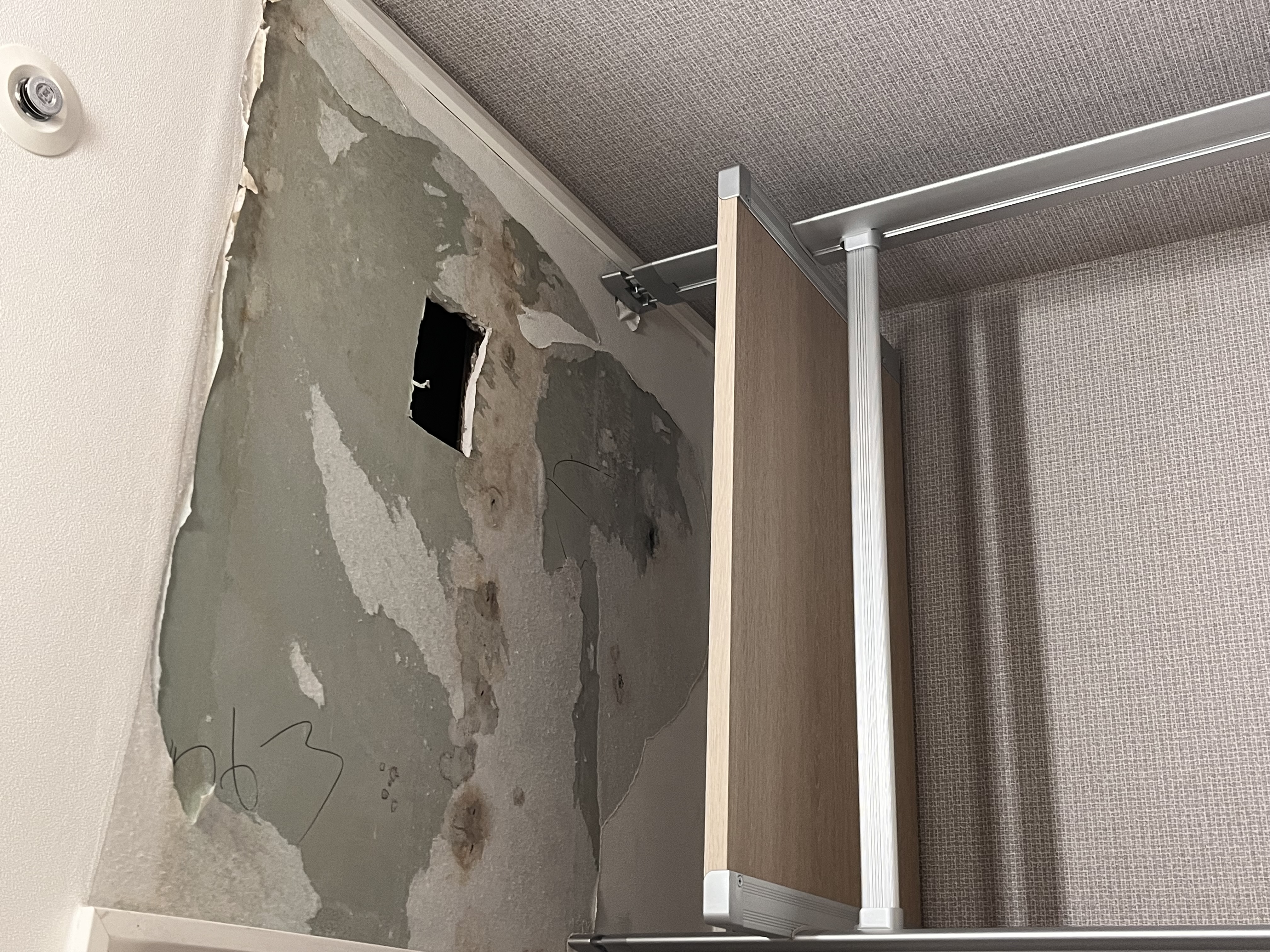 사용자 부주의로 인한 결로로 보인다고 하여 우리는 나름 관리를 열심히 했으며, 다른 곳은 곰팡이가 안생기는데 드레스룸 천장에만 생기는게 이상하다고 하니 천장을 뜯어보고 다른 흔적이 있는지 보자고 하였습니다.